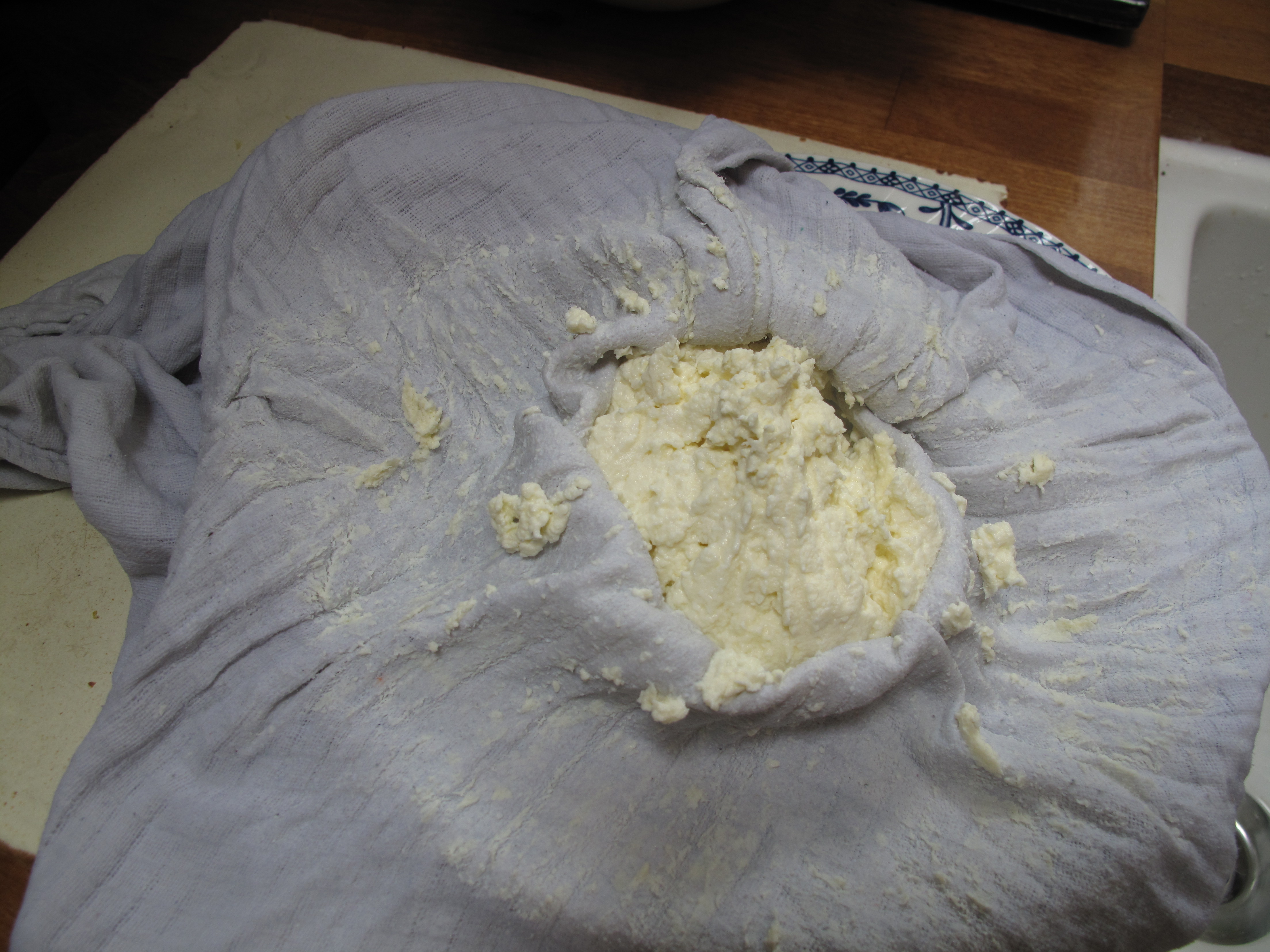 And now for the magic. I got quite excited at this point. In went the lemon juice, I stirred it all up and almost immediately curds began to form. Ten minutes later it was full of big lumpy floaty cheesy bits. Success! One cheesemonger I read said that she loved this point because it smelt like a baby’s head. This is true but only in the sense that babies smell like cheese a lot of the time.