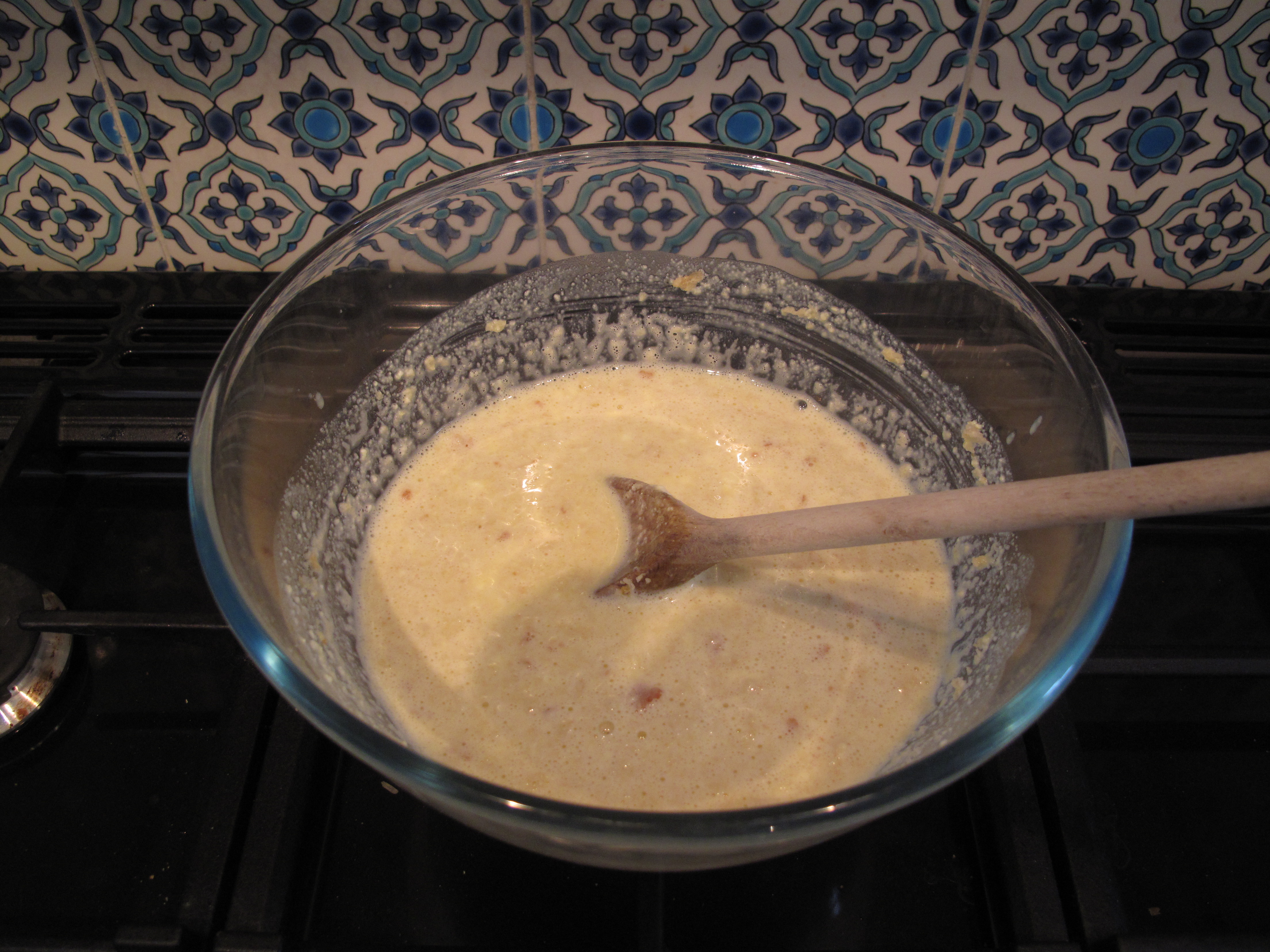 Beat the egg whites until shiny and stiff. Fold gently into the cream cheese mixture. Bake for 45 minutes. Delicious served with crème fraîche or stewed fruit (we ate it with a nice seasonal rhubarb).