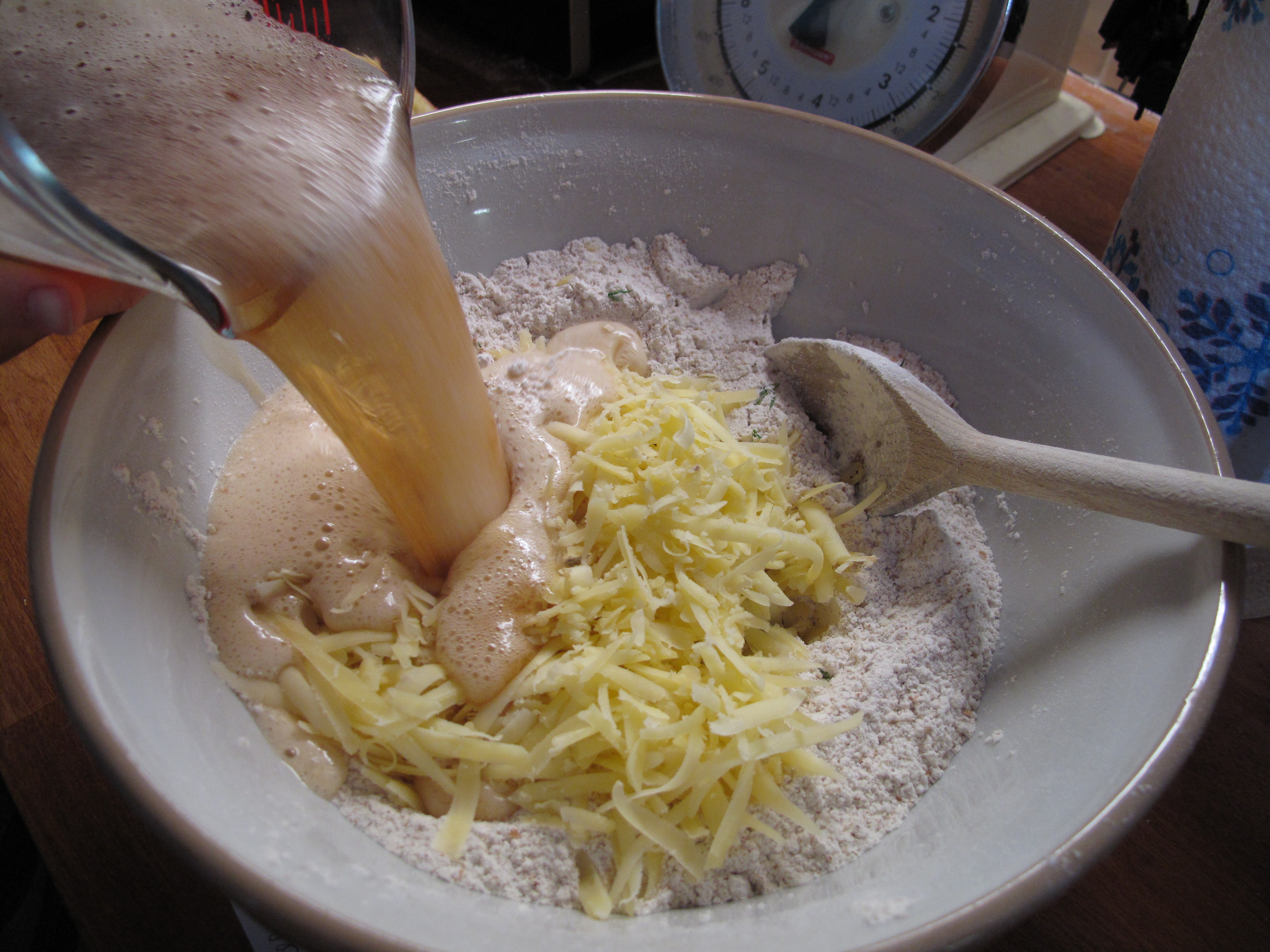 Cheese and beer made me think of ploughman’s lunches and so here is the recipe for Olde Sussex Cheese and Beer Bread. I wanted to use a beer from The Long Man Brewery which I had supped in a pub beer garden at sunset (that sounds idyllic, I realise, but doesn’t factor in trying to stop three small boys from whacking each other with sticks). Unfortunately, however, I could only find it on draught and was not convinced of my ability to transport a pint back to London or that a Buzz Lightyear beaker was an appropriate method of transportation. So I confess to using a Kentish brew. I realise that I have probably violated county lines and will never be allowed back into either county again but, hey, talk to my local Budgens.