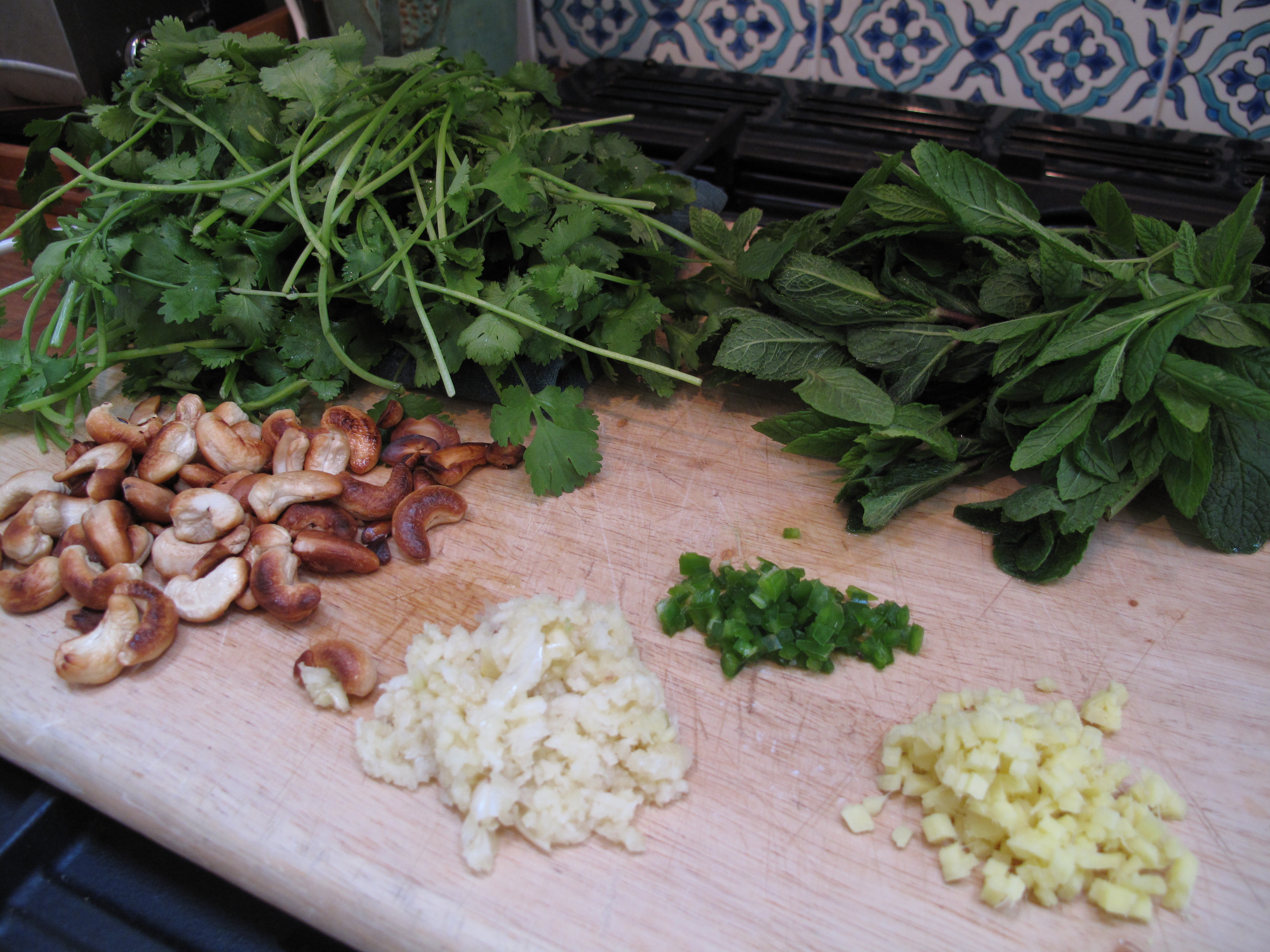 Put the ginger, garlic, chillies, coriander, mint and 250ml of water in a blender and process to a smooth paste. Add the fried cashew nuts and 150ml and puree.