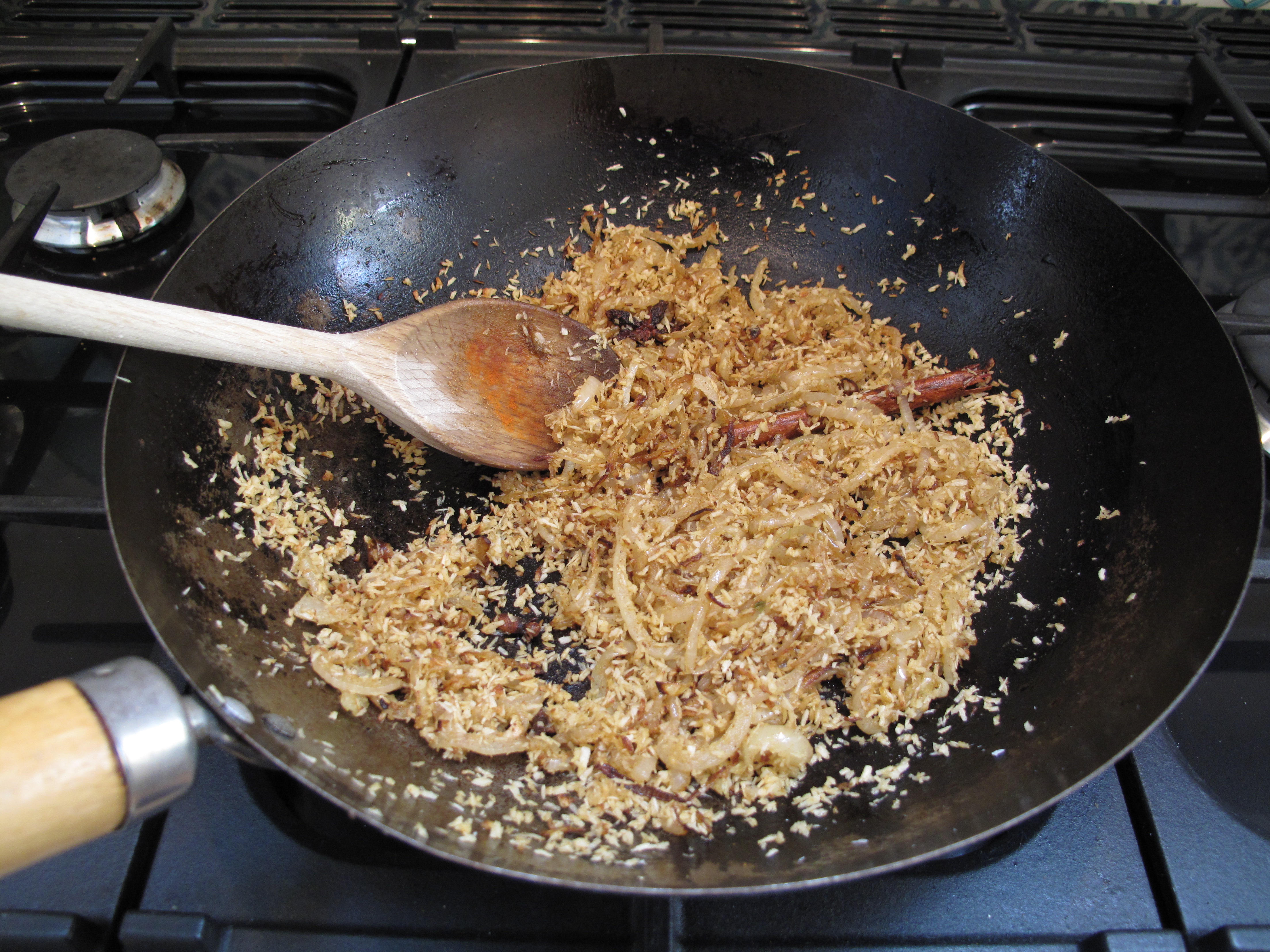 Heat the oil in a pan, add the whole spices and let them crackle for ten seconds. Add the onions and fry until golden brown. Add the ground spices, desiccated coconut and salt to taste and fry until the coconut starts to brown.