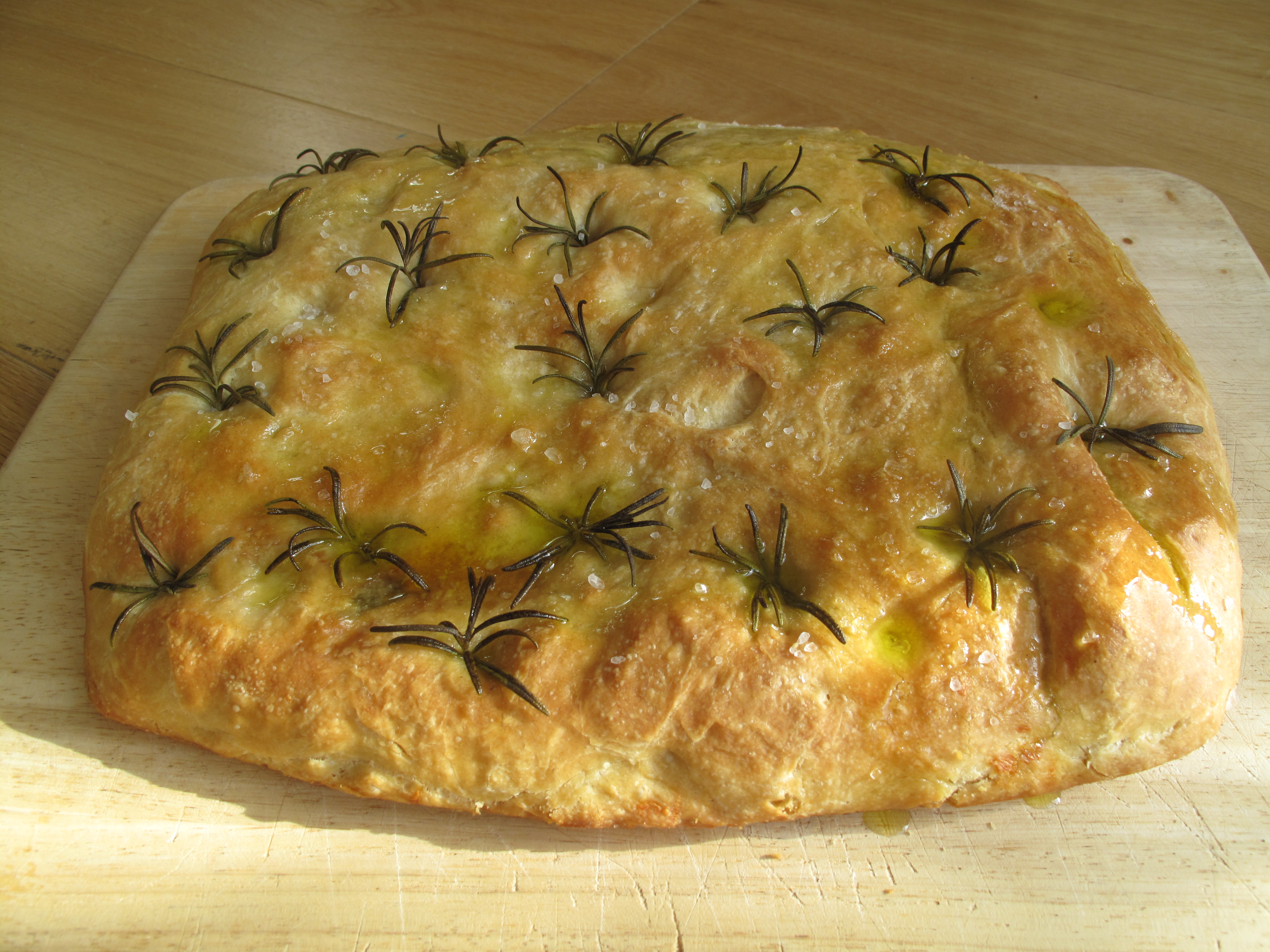 Cover it with oiled cling-film and leave it in a warm place for about an hour or until the dough has doubled in size. Remove the cling-film. Uncover the dough and use your fingertips to make little holes all over the top. Brush about 1 tbsp olive oil over the top and press sprigs of rosemary into the holes. Sprinkle with salt.