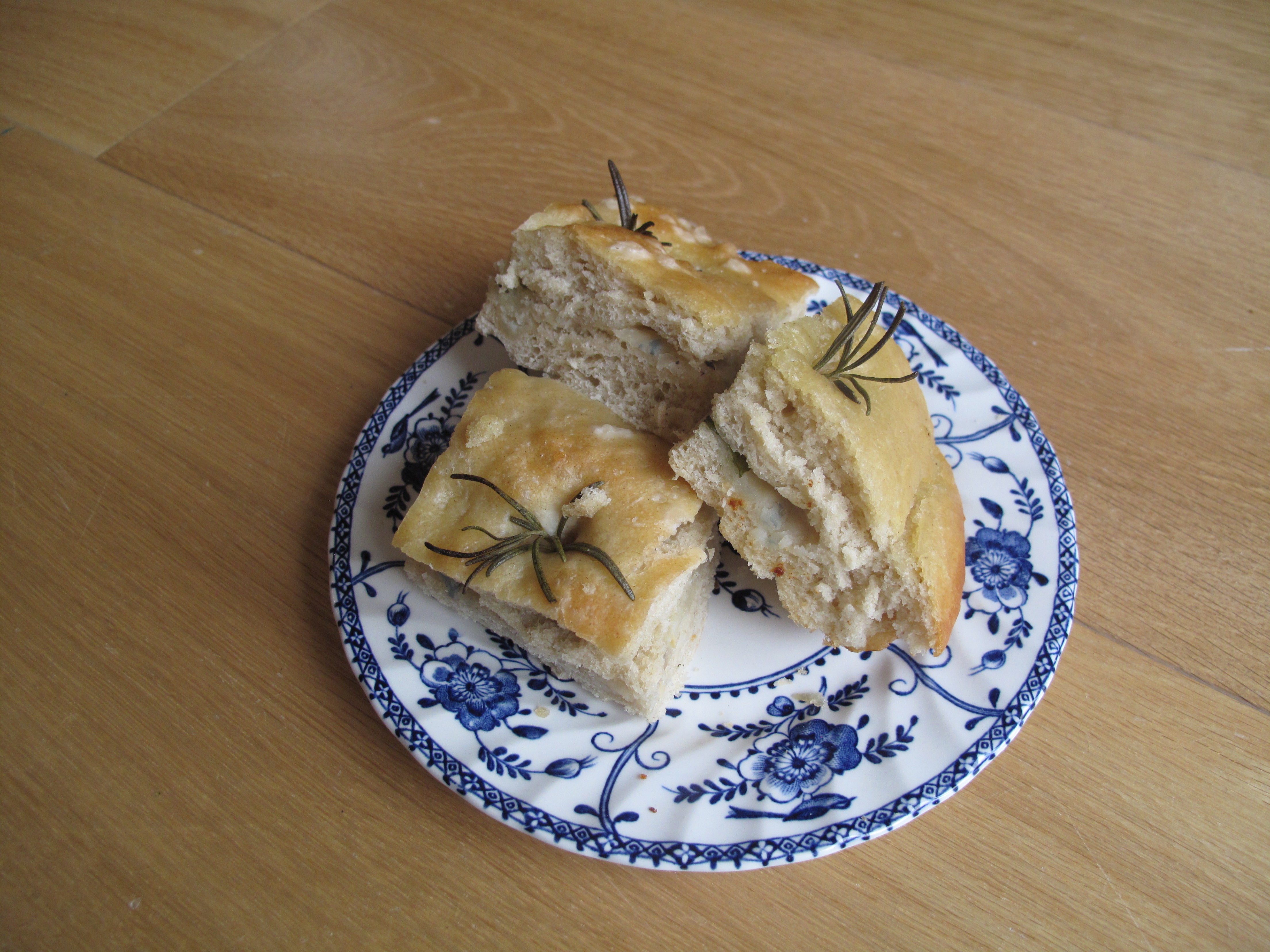 So I decided to stop waiting for the sun to come out and get on with making the focaccia I’d been thinking about. I was considering a ‘Quattro Formaggi’ focaccia but it started to feel a bit like cheese over-kill so I settled for three cheeses – mozzarella, dolcelatte and parmesan. It’s best eaten warm from the oven so the cheeses are still squidgy but it’s also nice cold. Predictably, Son the Elder refused to touch it because it contained ‘ponky’ cheese and ‘has palm trees on the top’.