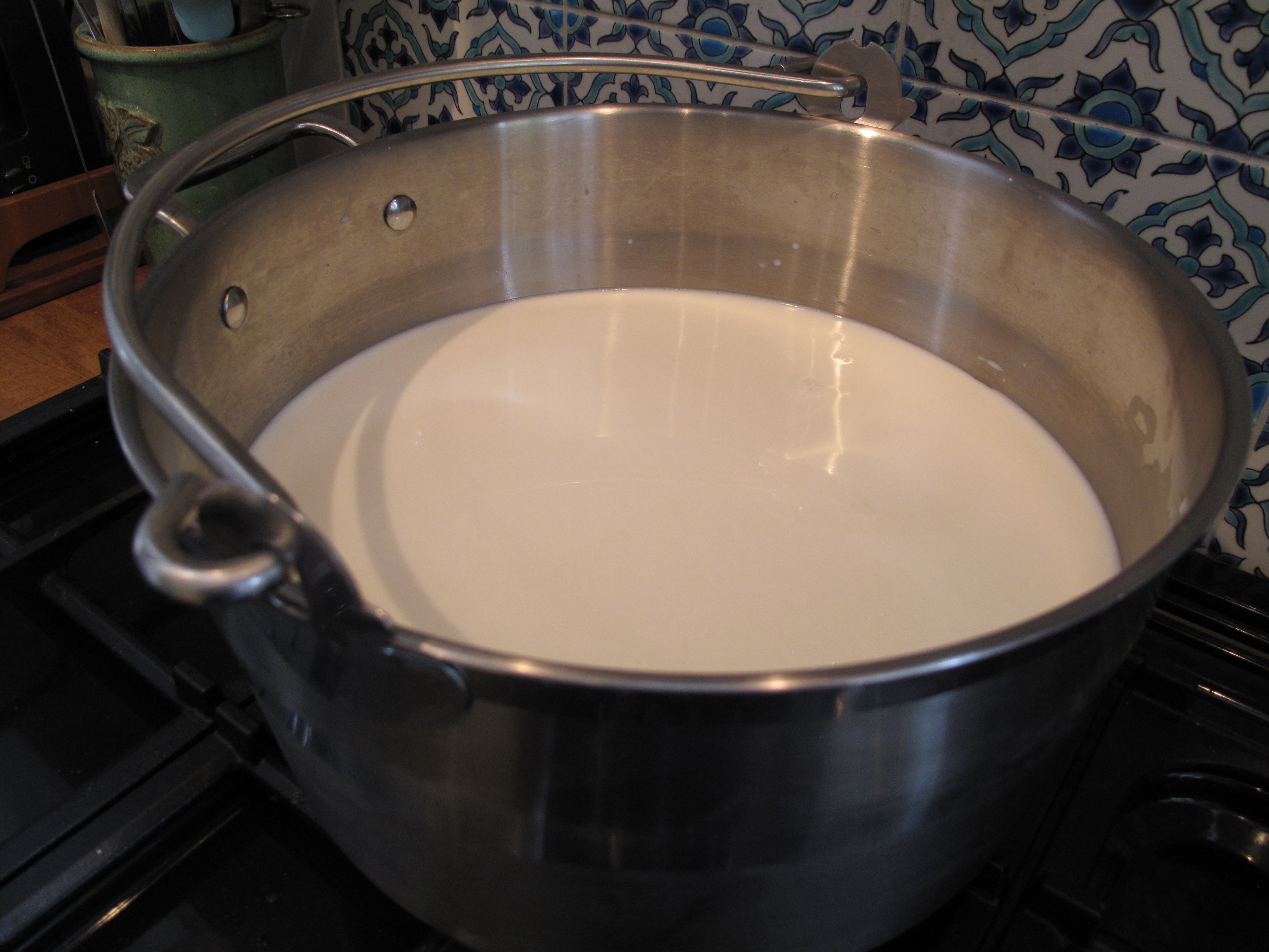 First of all I had to heat 5 litres of milk to 32˚C (well, okay, first I realized I didn’t have the right thermometer and had to go begging round my neighbours – an inauspicious start, you might say). I then added 100ml of my precious mother culture, stirred well and left it to ripen for 30-45 minutes.