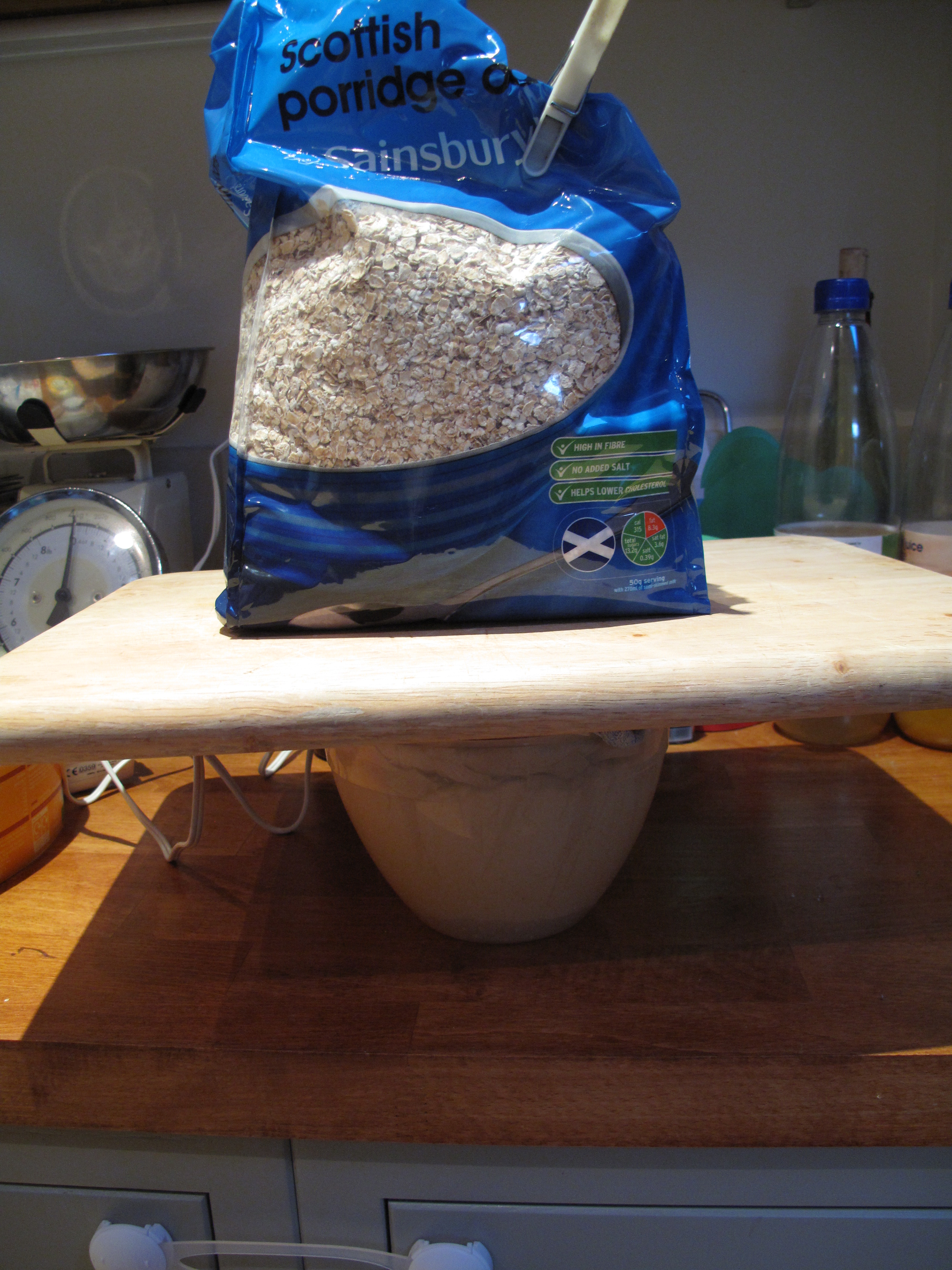 Finally, I put my cheesy bits into a cheese-cloth lined mould and pressed it with 1-2kg for 10 minutes. I hadn’t got a proper cheese mould (can you see a pattern forming by now?) and so I put it into a bowl. Which was fine until the next step where I had to take it out, turn it over and put it back in the mould. Obviously , it didn’t fit so I had to unceremoniously shove it back in and squash it down.
