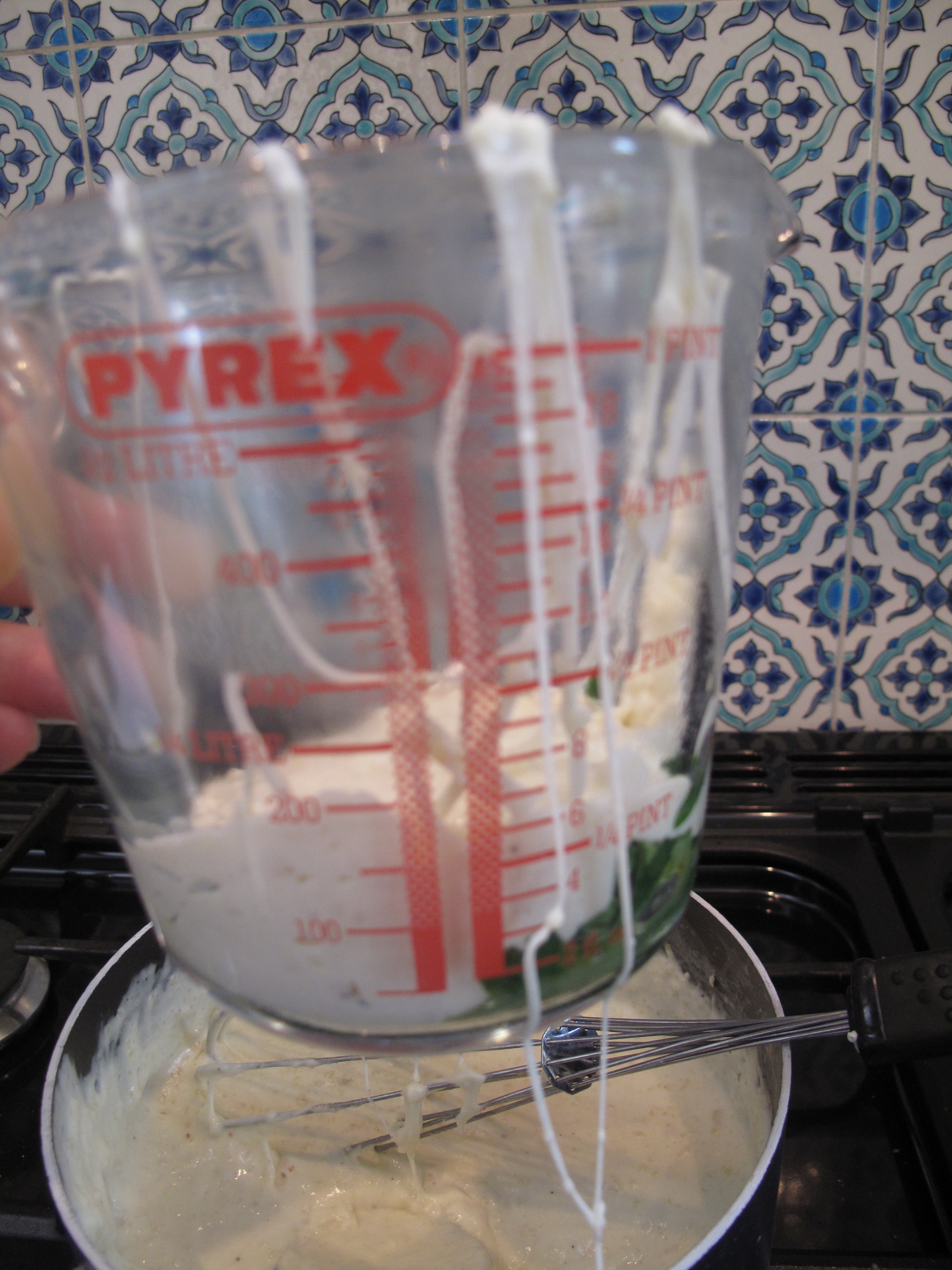 I decided to crack on with the sauce by putting all the cheese, cream and egg yolk in, in the hope it will disguise the lumps. However, I didn’t anticipate that by using Jarlsberg, I would create the world’s largest ball of cheese-string: