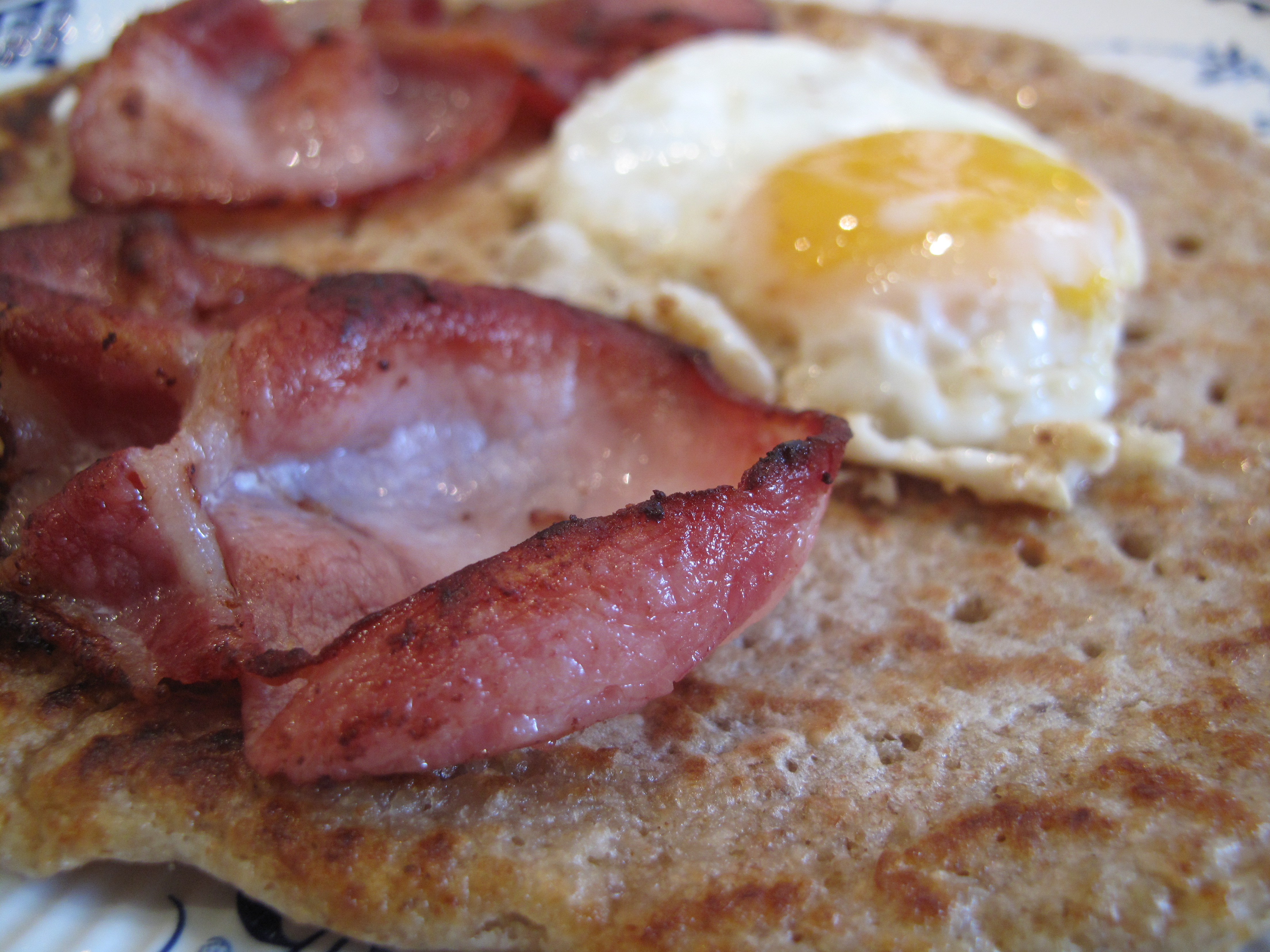 I grew up on oatcakes and I miss them. We’re not talking the hard biscuity type of oatcake here but a plate-sized pancake made from oats, flour and yeast that you fill with cheese or bacon, sausage or egg (I’ve never been a fan of adding sweet fillings but it can be done). I’d come home from school, spread one with butter and roll it up. There’s nothing like it, cutting it in half to see an oaty, buttery spiral of loveliness.