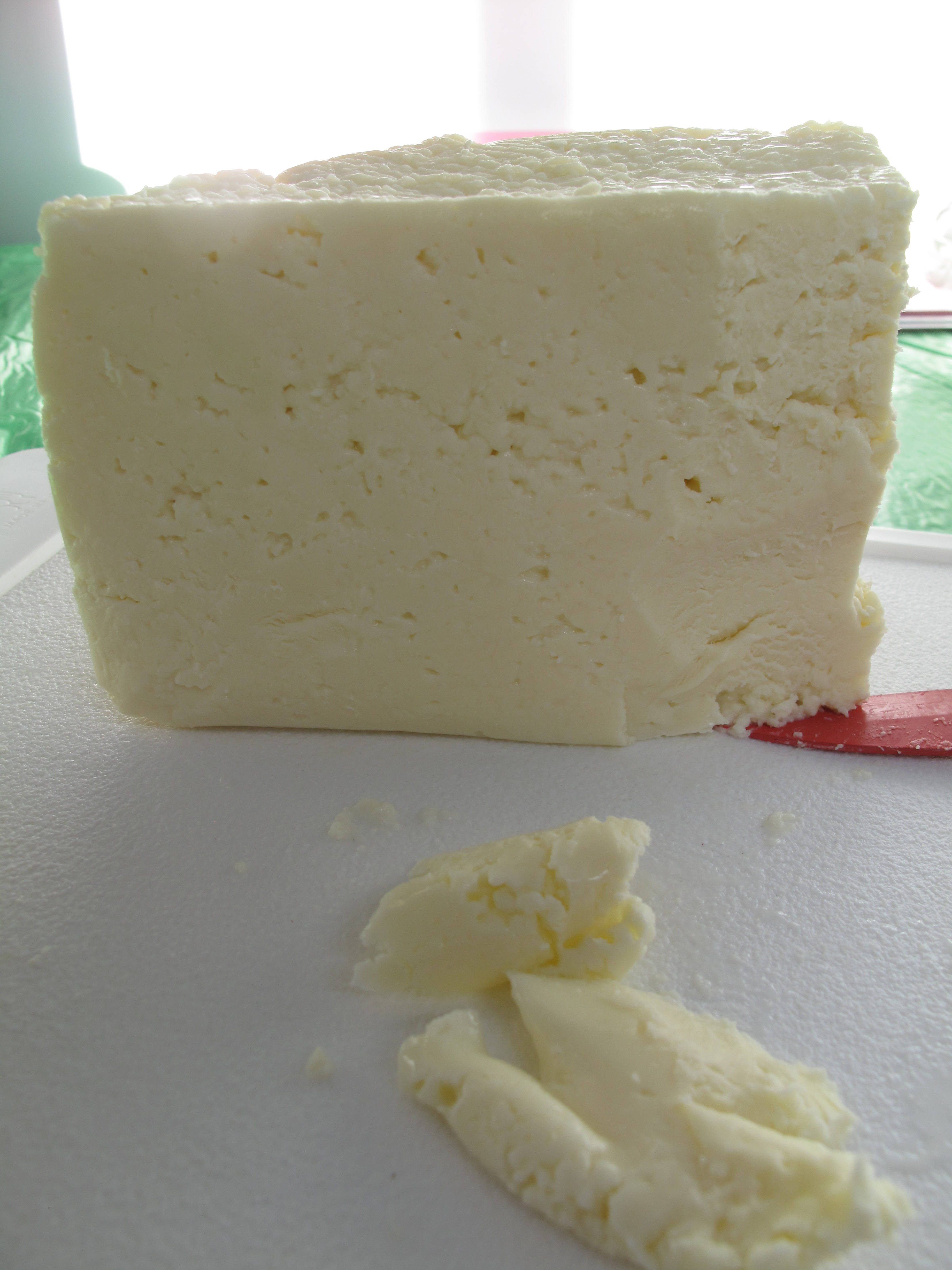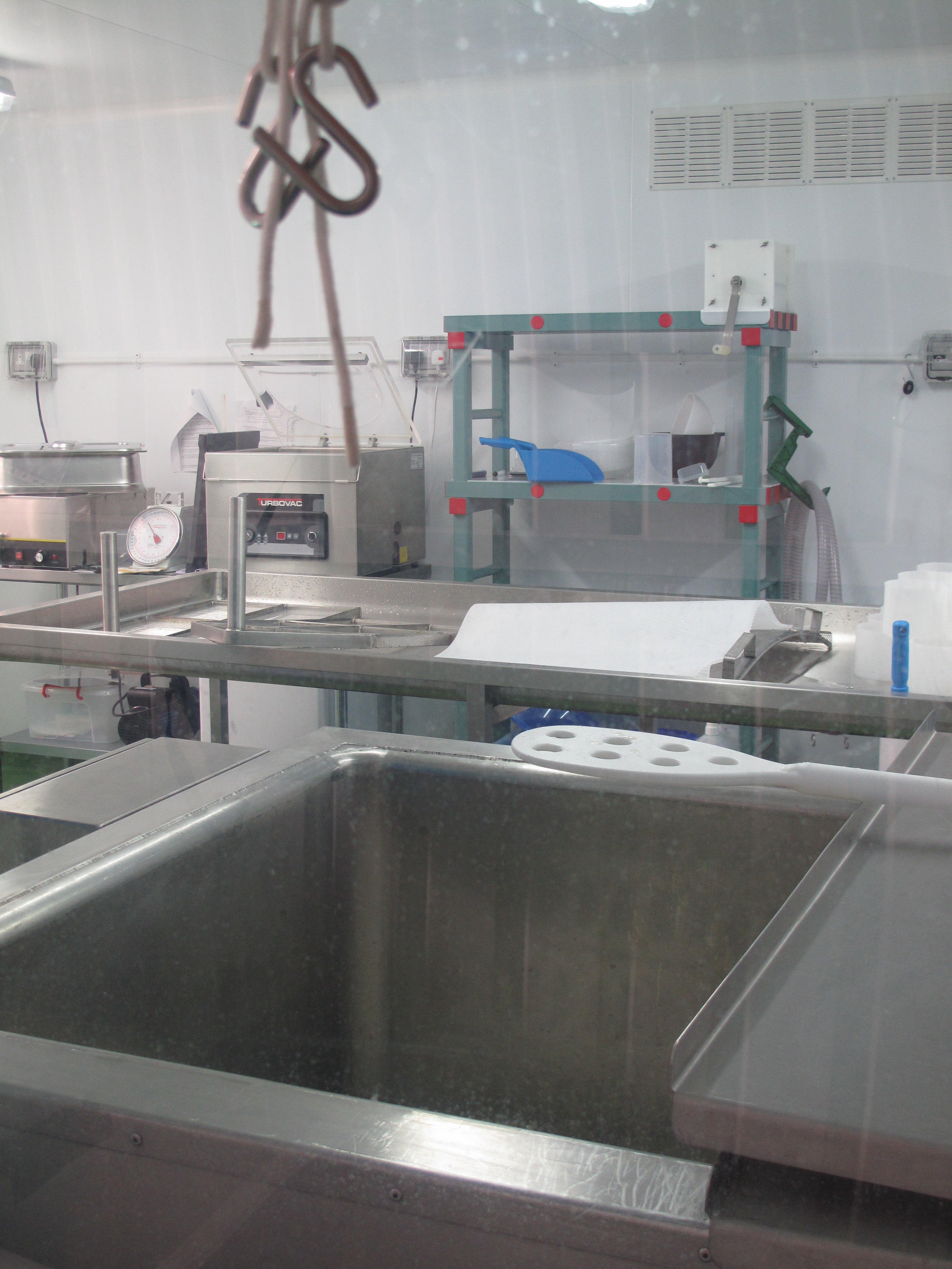 And, oh the cleaning up! I was amazed by the spotlessness of Kristen’s one-room operation. When I’ve made cheese at home and a fly has touched down on my curds or I’ve found a cat hair wound into the cheesecloth, I’ve comforted myself by thinking, ‘Ach, people used to make cheese in their barns in all kinds of filth. It’ll be fine.’ But if your vision of a dairy is all wooden cheese-presses and three-legged milking stools, you couldn’t be more wrong. From a questionnaire at the door about whether I’m harbouring nuts or dysentery to the two-stage shoe-changing operation (my flip-flops to crocs and then crocs to funky white wellies that Pan’s People would have been proud to prance in), cheese-making these days is a hygienic business. Surrounded by stainless steel trolleys and scientific equipment, I could have been in an operating theatre were it not for the lovely smell of warm milk in the air.