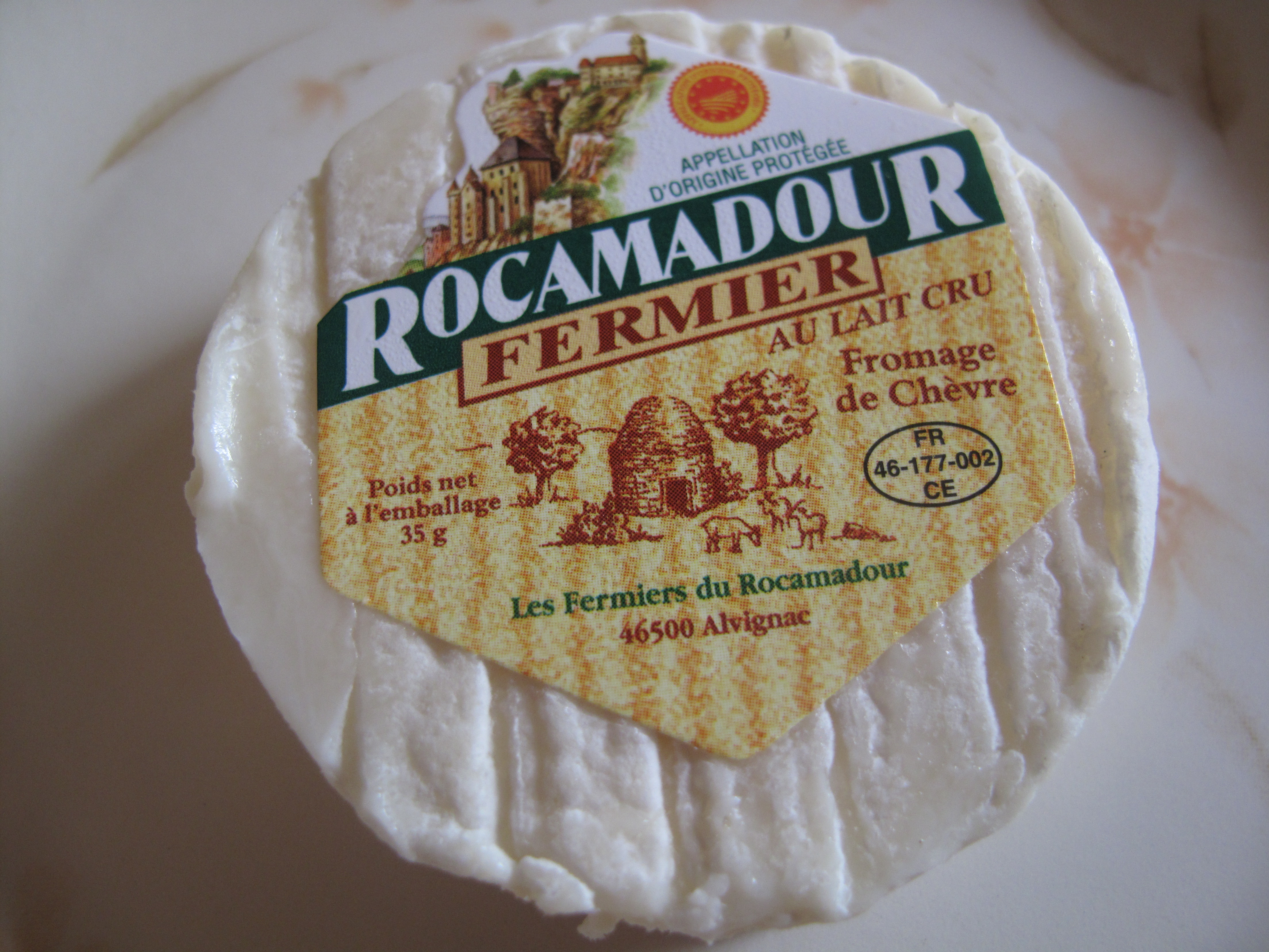 Rocamadour is a soft raw goat’s milk cheese, produced in the Périgord and Quercy regions of France around the town from which they take their name – Rocamadour, a village which appears to cling perilously, if picturesquely, onto some cliffs. Each cheese is about the size of the palm of your hand and weighs about 35g. The cheese was previously known as Cabécou de Rocamadour but in 1996 it was granted AOC status (which I previously wrote about under Pont L’Évêque) and so set itself apart from all the other Cabécous that don’t conform to the AOC regulations (although interestingly, I read in the rather lovely The Whole Fromage by Kathe Lison that makers of Cabécou de Périgord are also working towards an AOC and so will be able to hold their heads high once more when they see Rocamadour putting on airs and graces in Carrefour).
