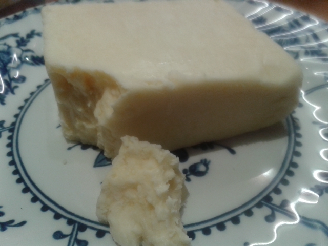 I saw his company (The Saddleworth Cheese Company) at a cheese show recently so thought I’d wander over and snaffle some of the cheeses on offer. I was surprised to see him there, looking a bit hot and bothered, doling out cheese samples and bobbing off to get a coffee for a colleague (pushing past all the middle-aged women whispering, ‘Look! It’s that bloke what used to be on Corrie!’) Someone later told me that he also judges at cheese shows and someone else that he writes about cheese and, the more I read about him, it seemed that he might actually make the cheese too. I took home a piece of his Lancashire cheese, called Mouth Almighty, and here it is, for your delectation and delight (apologies for the dreadful photo; this is what happens when you drop your camera):