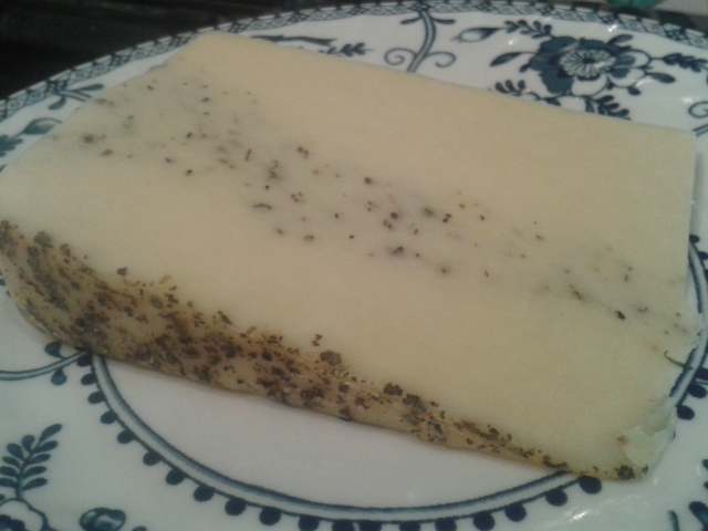 Traditionally Sage Derby was a ‘holiday cheese’, made in the springtime for eating at Harvest or Christmas. Nowadays it’s made all year round and, in the case of Fowlers, matured for around nine months. Even if you’re a cheese purist who doesn’t like ‘bits’ in their cheese, you should give this one a try. The cheese itself is not unlike cheddar, slightly nutty but more buttery. The taste of the sage is subtle; herbaceous and grassy without overpowering the cheese. We ate some on crackers and then stuffed the rest into the centre of baking apples.