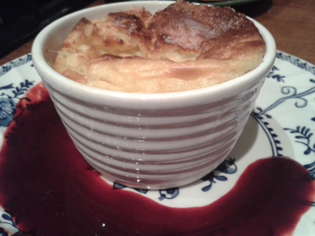 First of all, let me apologise for what must be the worst photograph of a soufflé in existence. I still don’t have a proper camera after I smashed mine, the soufflé collapsed when I went to find my phone and the addition of the sauce makes it look like some sort of CSI crime scene. But trust me, it does taste really good!