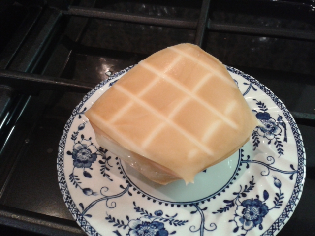 The cheese is made by Green’s of Glastonbury and traditionally smoked over oak by Capreolus Fine Foods, an artisan smokehouse in Dorset. It has all the creamy texture of a mozzarella but a very smoky flavour. Here it is, with a criss-cross bottom, I imagine from sitting on a grill over the smouldering wood-chips.