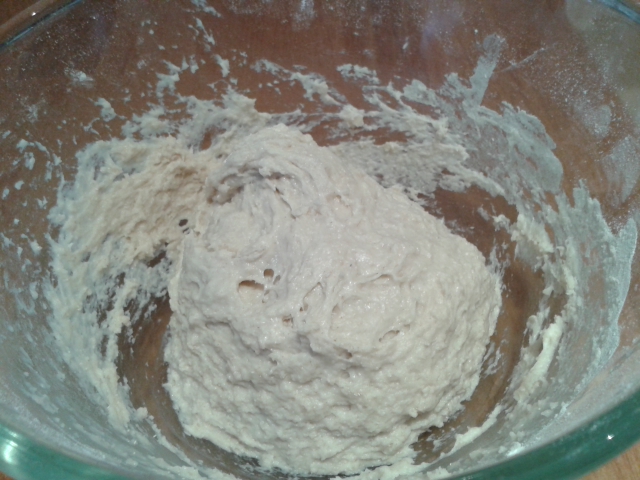 Warm the milk in a saucepan very gently until tepid. Sift the flours into a large bowl and stir in the yeast, salt and sugar until well combined. Make a well in the centre of the mixture and stir in the warm milk. Beat well with a wooden spoon for 3-4 minutes, or until the batter is thick and elastic. It will really look quite gunky at this point:
