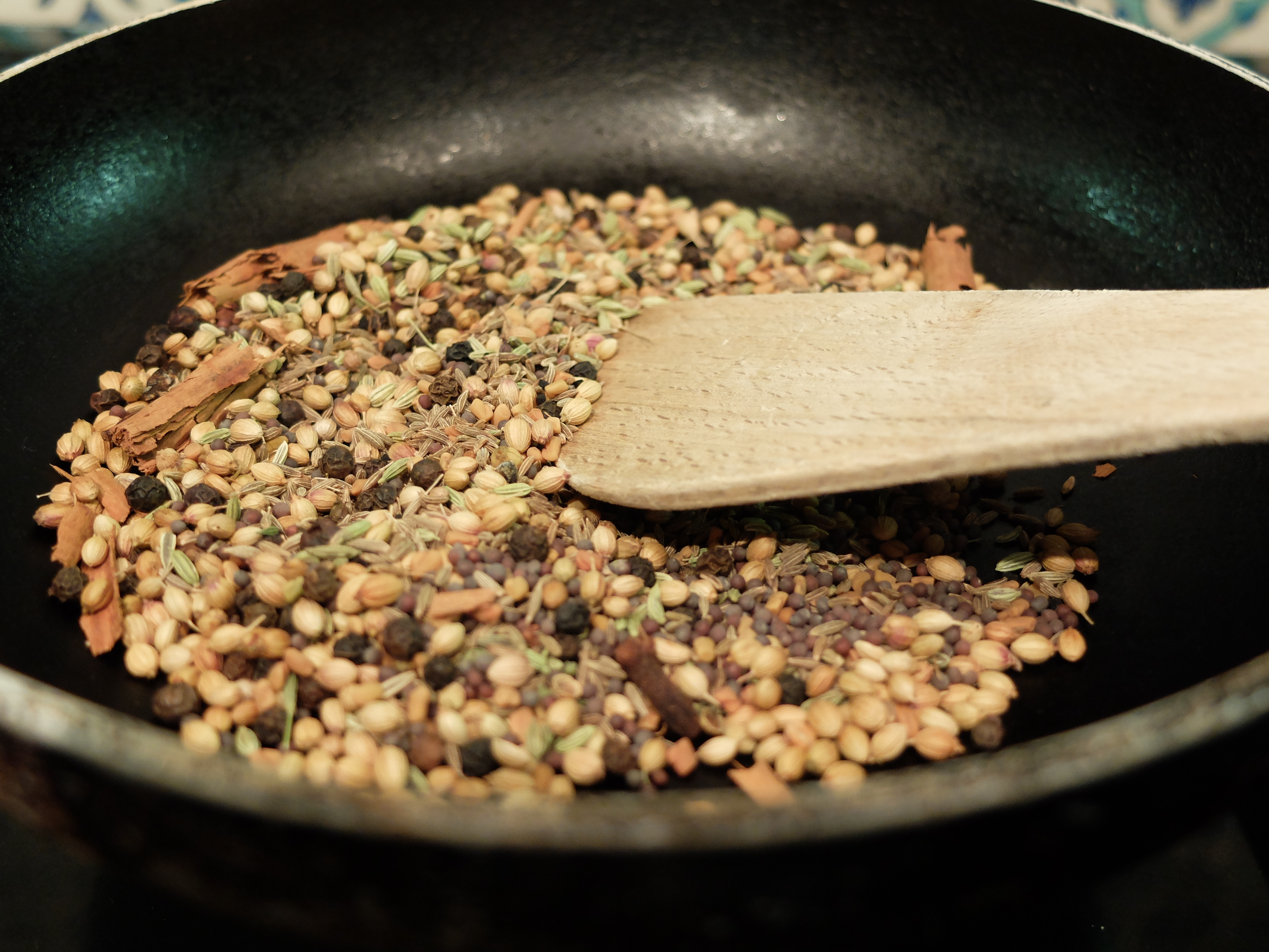 Put the seeds, cloves, cinnamon and peppercorns in a dry frying pan and dry fry over medium heat until the spices begin to smoke.