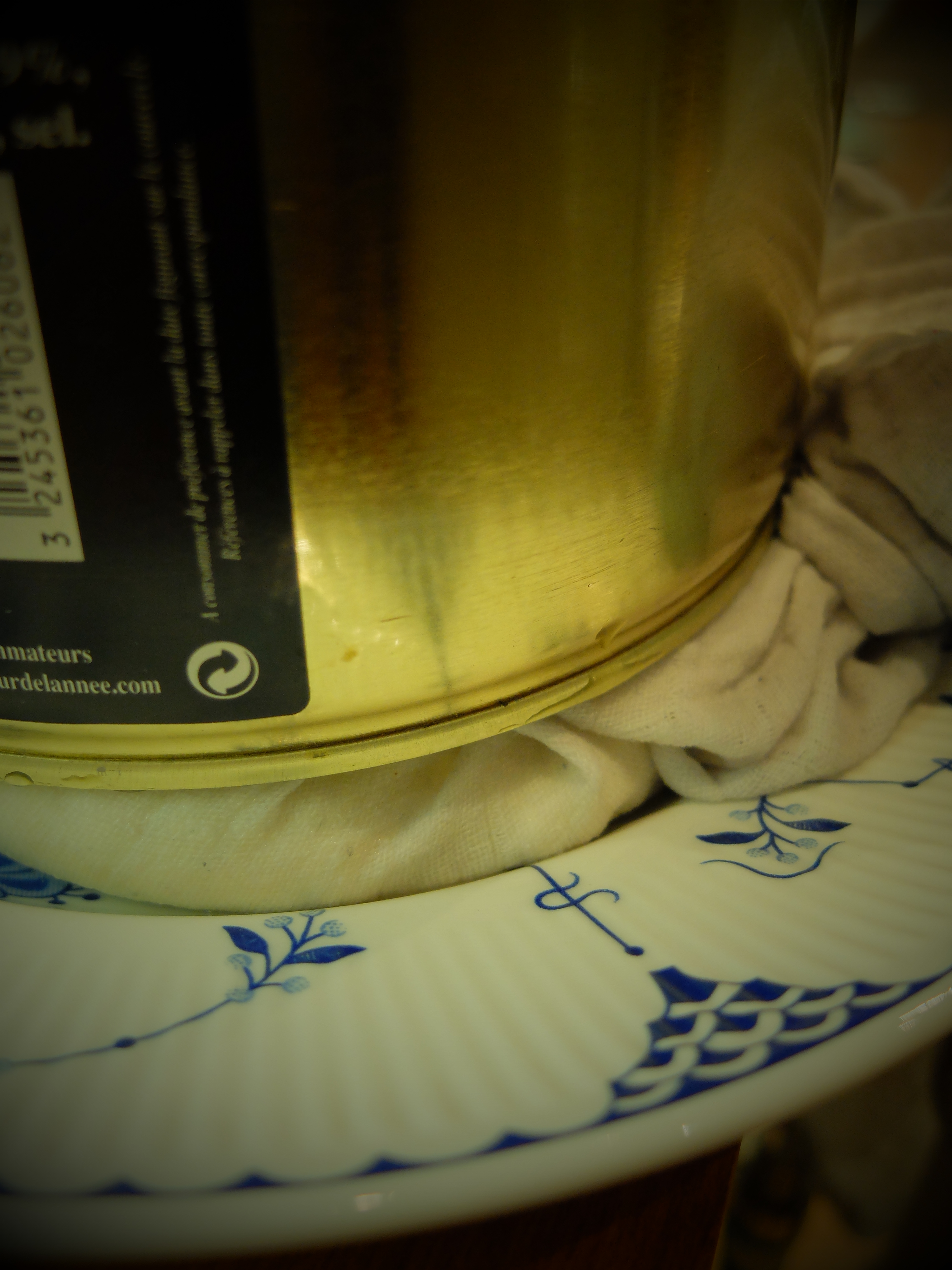 By the time I had cleared up the pint glass carnage, the curds had drained nicely (I hung the knotted cheesecloth from the draining board). Put a heavy object (this is a 1.25 kilo tin) on top of the cheesecloth and leave it to press for about thirty minutes.