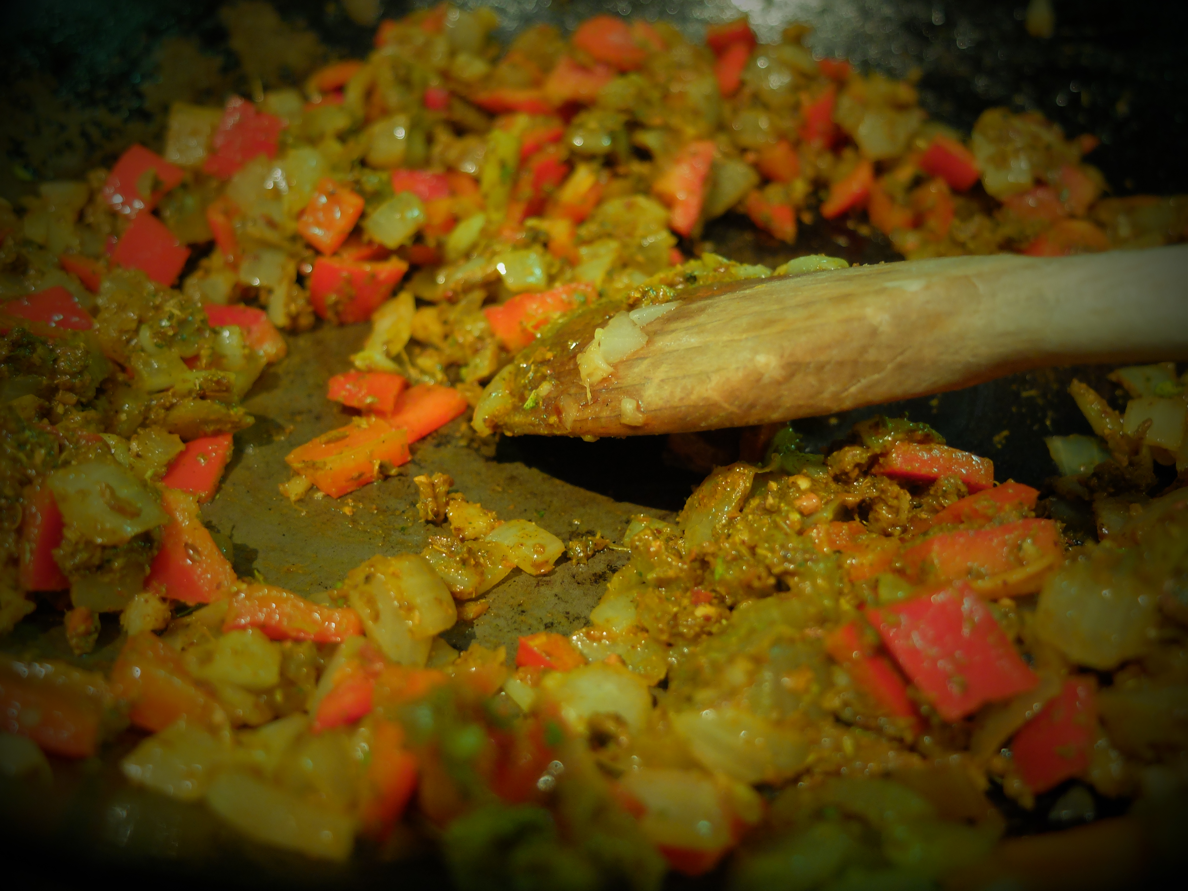 Finely chop up one onion, three cloves of garlic, a thumb-sized piece of ginger, one red chilli and one red pepper. Fry in some oil until softened.
