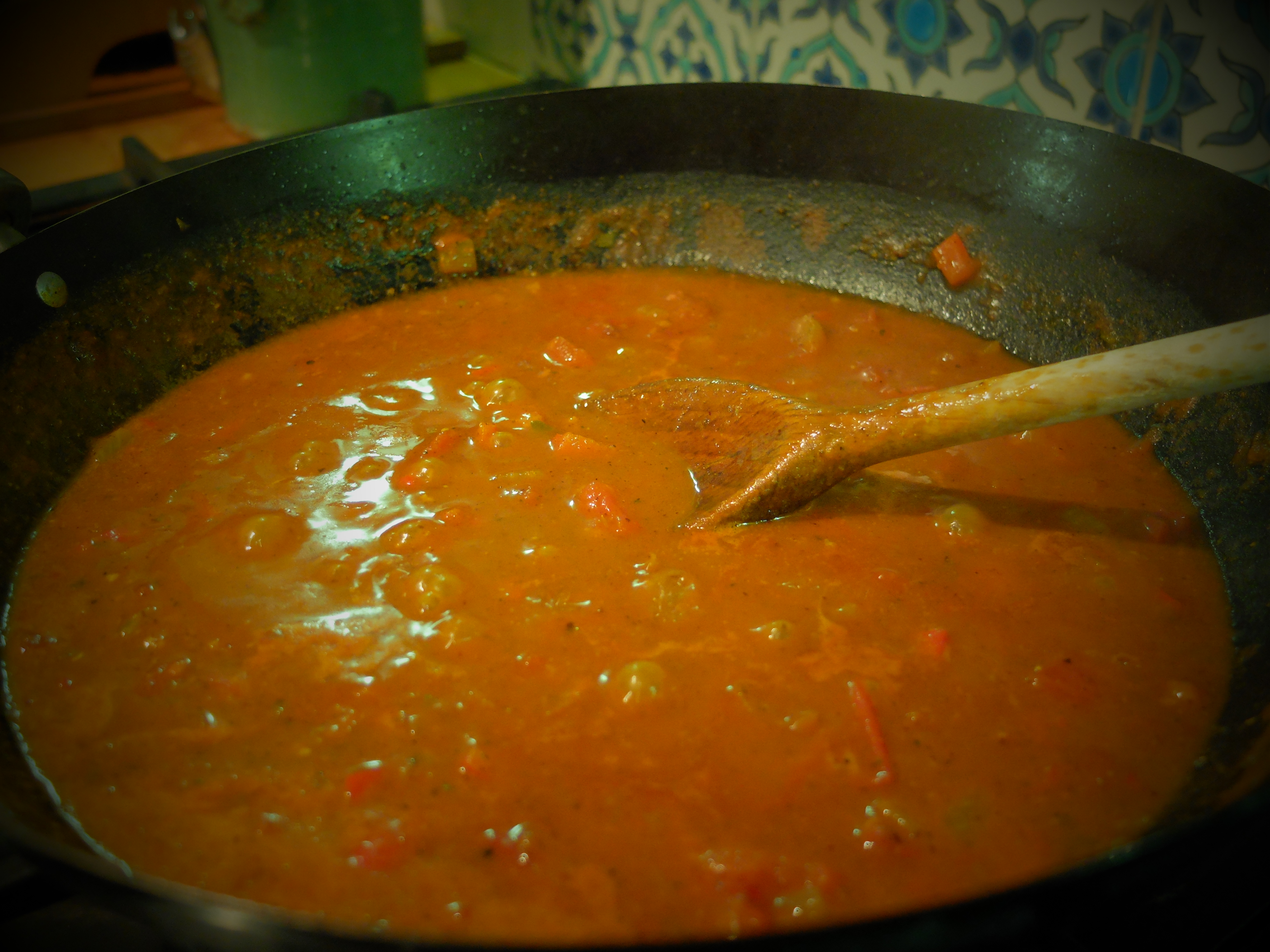 Add one tablespoon of Balti Masala paste per serving and stir well whilst heating it up. Add one tin of tomatoes and 450ml of stock (I used chicken). Bring to the boil and simmer for about 25 minutes.