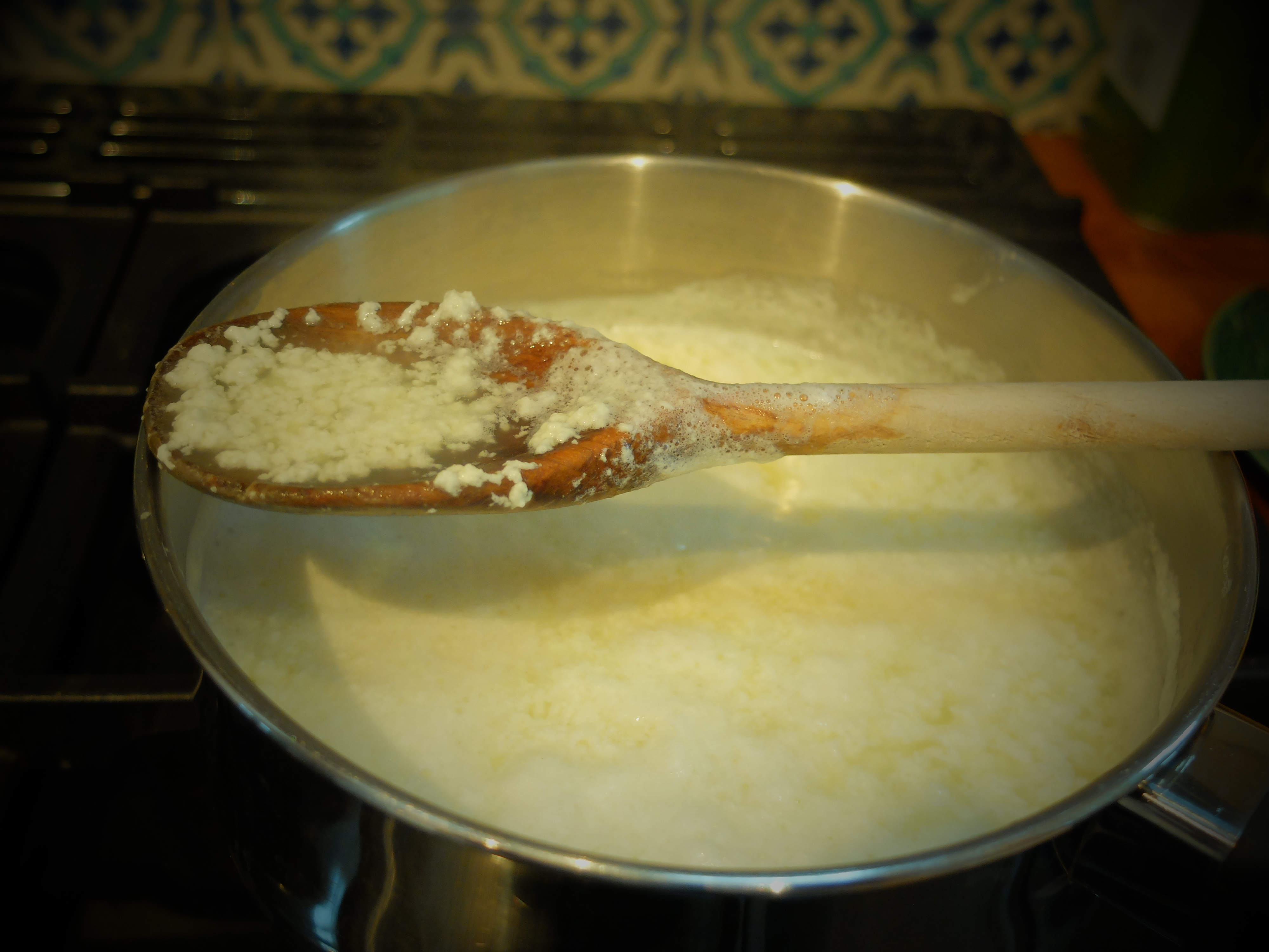 First of all, it was time to make the ricotta (cheese-pedants will note that this isn’t proper ricotta which is actually made from the leftover whey but it’s kind of similar). One litre of milk went into a saucepan and I gently heated it until it started to boil (careful it doesn’t burn on the bottom of the pan). Add the juice of one lemon, remove the pan from the heat, give it a good stir and the curds should separate from the whey. If it doesn’t happen, whack in some more lemon juice.