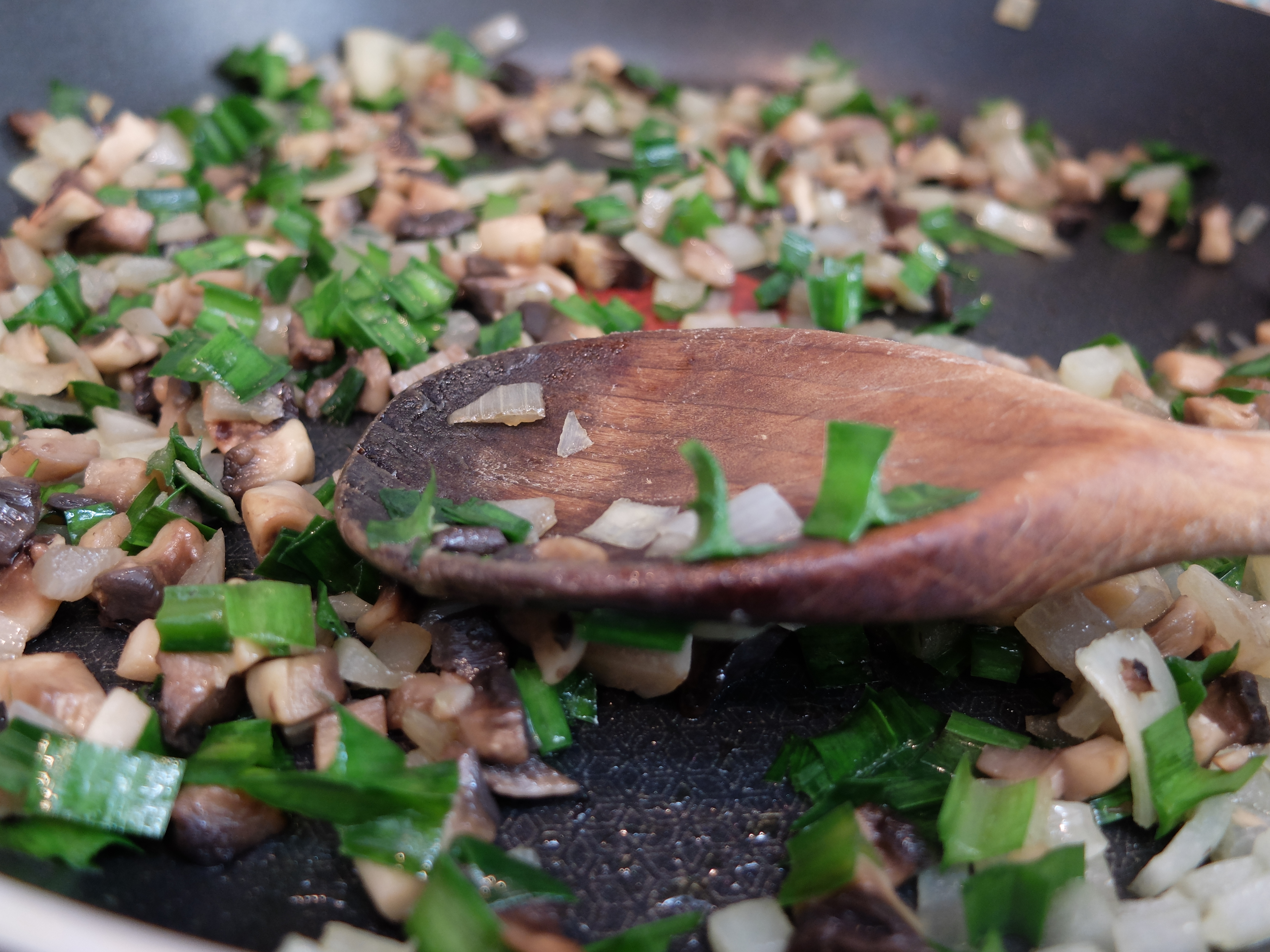 Meanwhile heat the olive oil in a frying pan and fry the onion until soft. Add the mushrooms and wild leek and fry until the mushrooms are cooked. In the picture below you can see why it’s called ‘three-cornered leek’ as when you cut the stem, if forms a sort of triangle.
