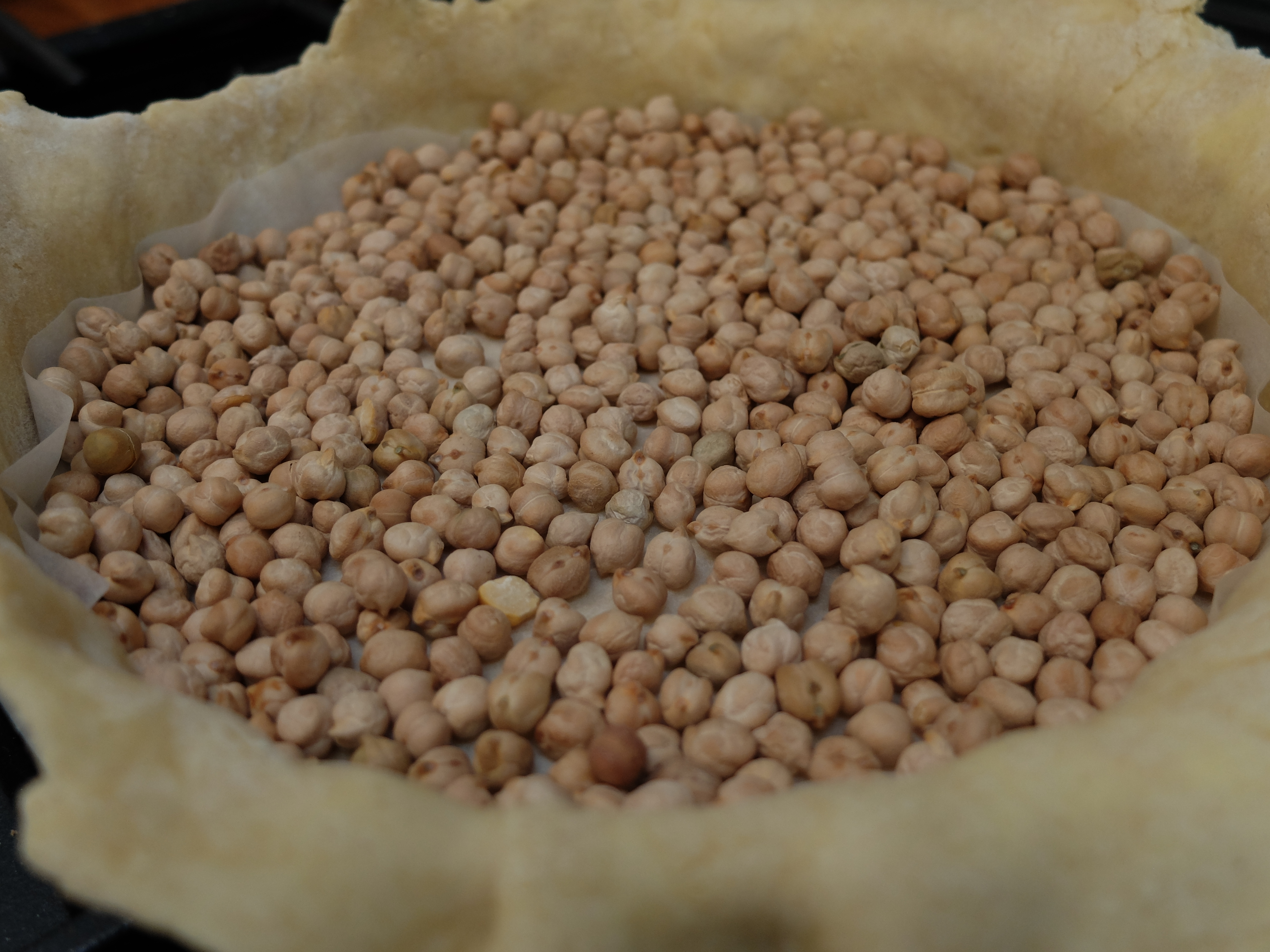 Lightly prick the base of the tart with a fork, line the tart case with a large circle of greaseproof paper or foil, then fill with baking beans.