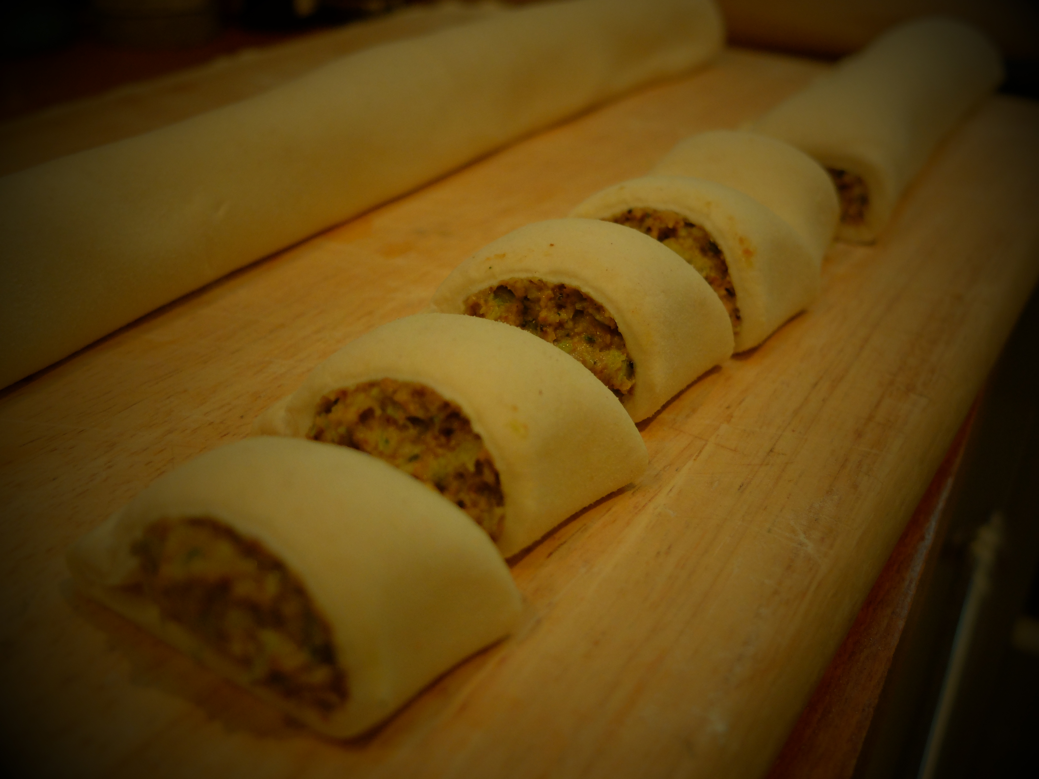 Fold over the pastry to engage the sausage mixture, seal the edges and cut into 3cm rolls.