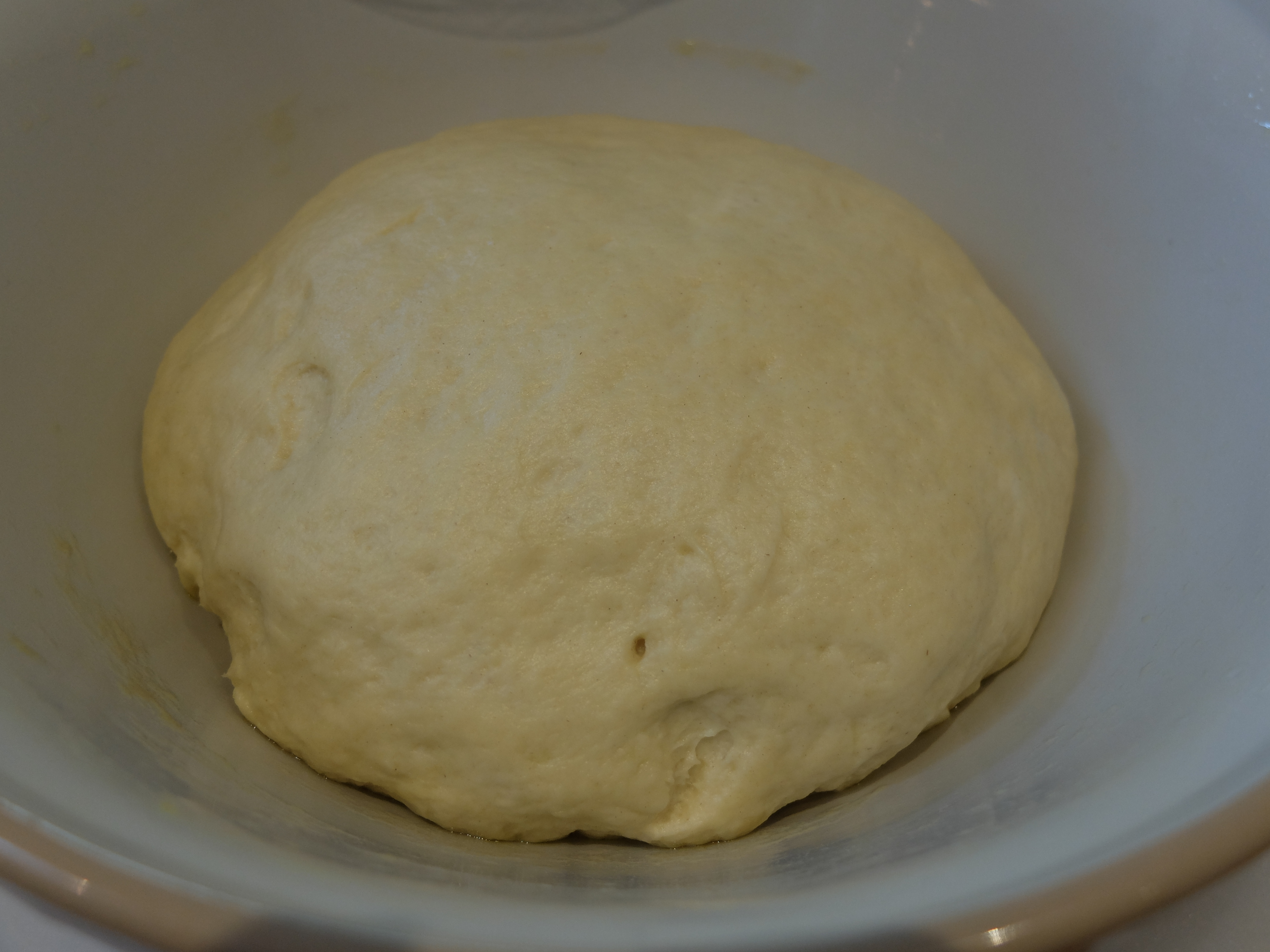 Let it rest for 15 minutes, then, keeping the dough in the bowl, knead it quickly folding the dough in on itself 10 times. Let it rest for another 15 minutes and repeat this kneading process, all in all repeating the process for 4 cycles of kneading, each with 15 minutes rest. Then shape the dough into a smooth ball, place it in a lightly oiled bowl, and leave it alone until it almost doubles (about 1.5 hours on a warm day). Here’s how it looked before it had risen: