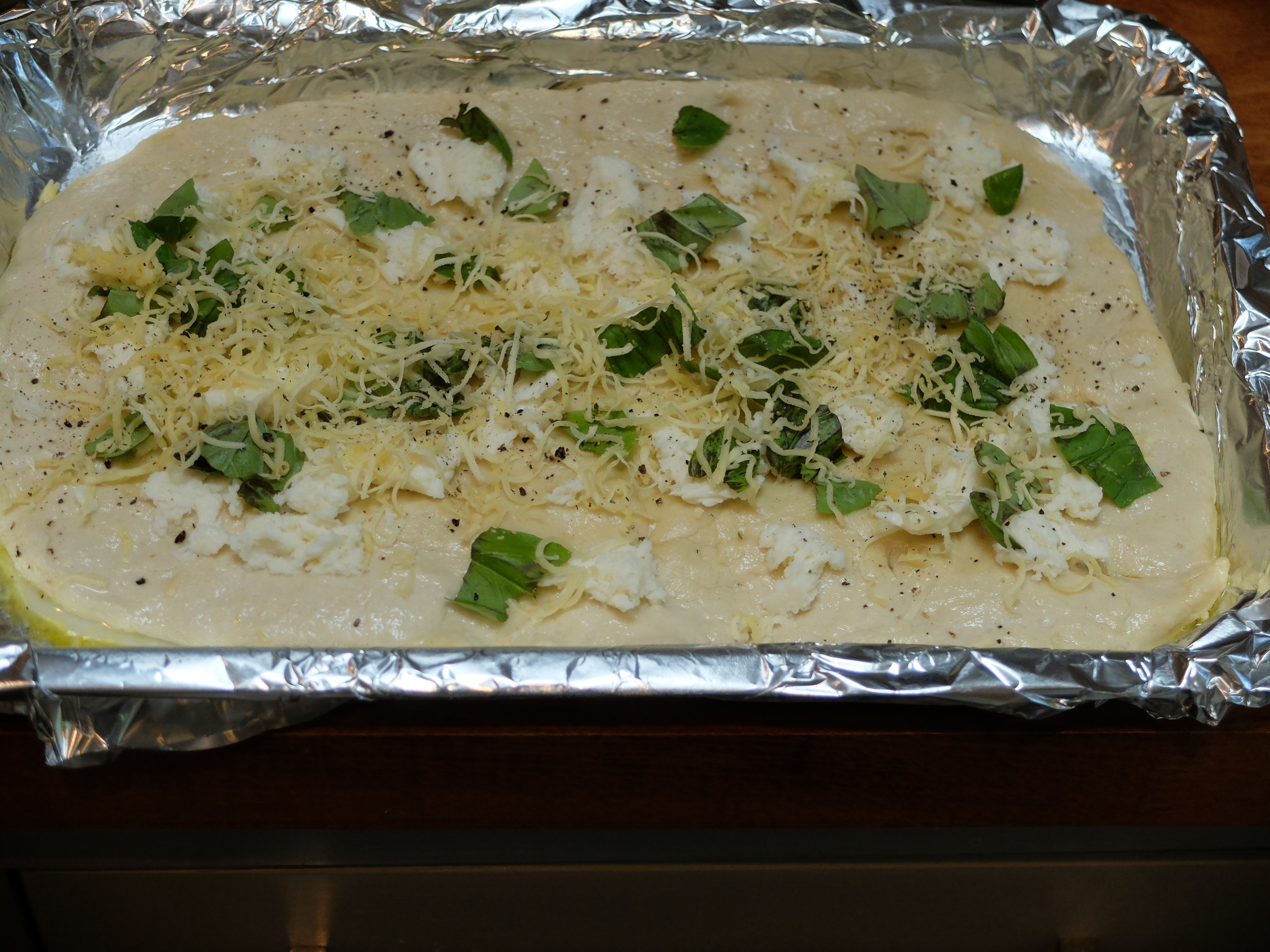 Split the dough into two and pre-heat the oven to 200˚C/180˚C fan-assisted/Gas Mark 6. Cover a baking tray with oiled tin foil or baking parchment and stretch one half of the dough to fit into the tray, pushing and pulling it gently until it fills it. Brush water all round the edges of the dough and sprinkle the basil, mozzarella and grated cheese into the centre with salt and black pepper to season.