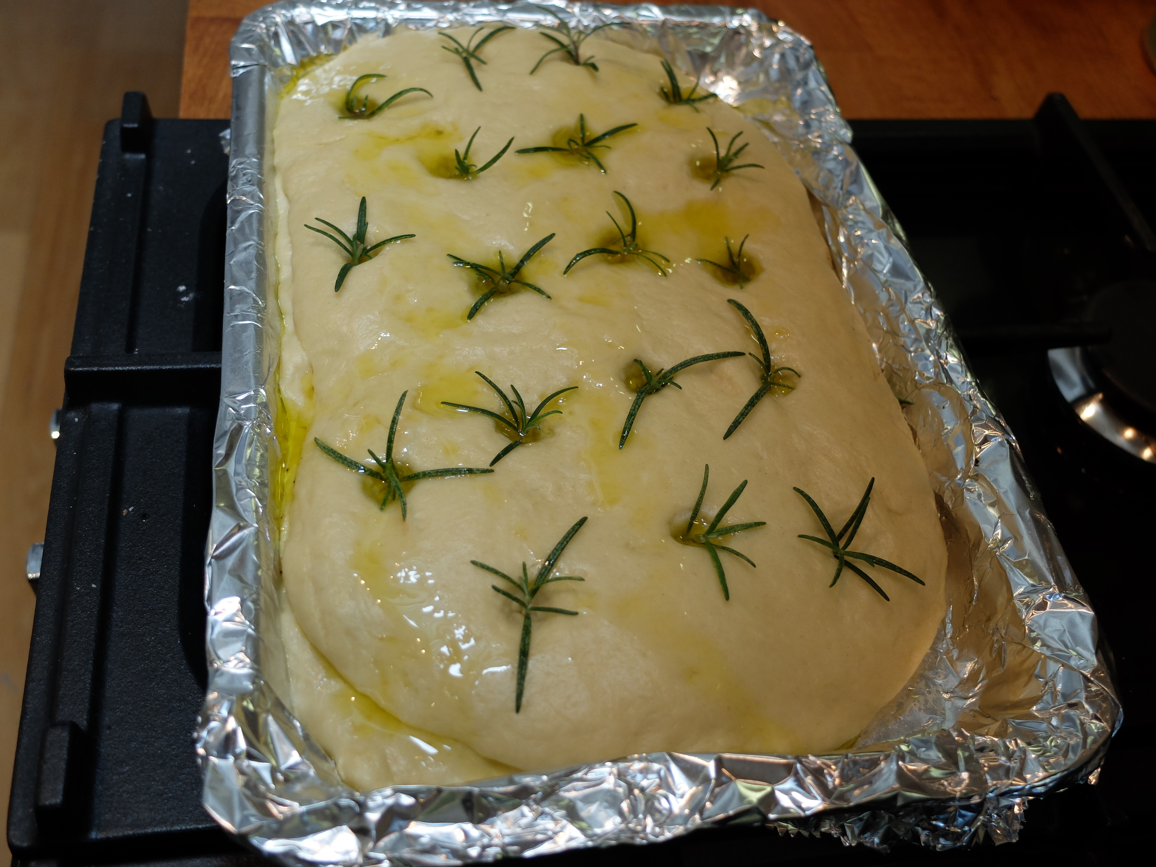 Stretch the second ball of dough out to a similar shape and press it on top, sealing the edges all around. Leave in a warm place until it has risen to nearly twice the size. Using the end of a wooden spoon, make indentations all over the top and place a sprig of rosemary in each. Slosh a generous amount of olive oil all over the top with a sprinkle of sea salt.