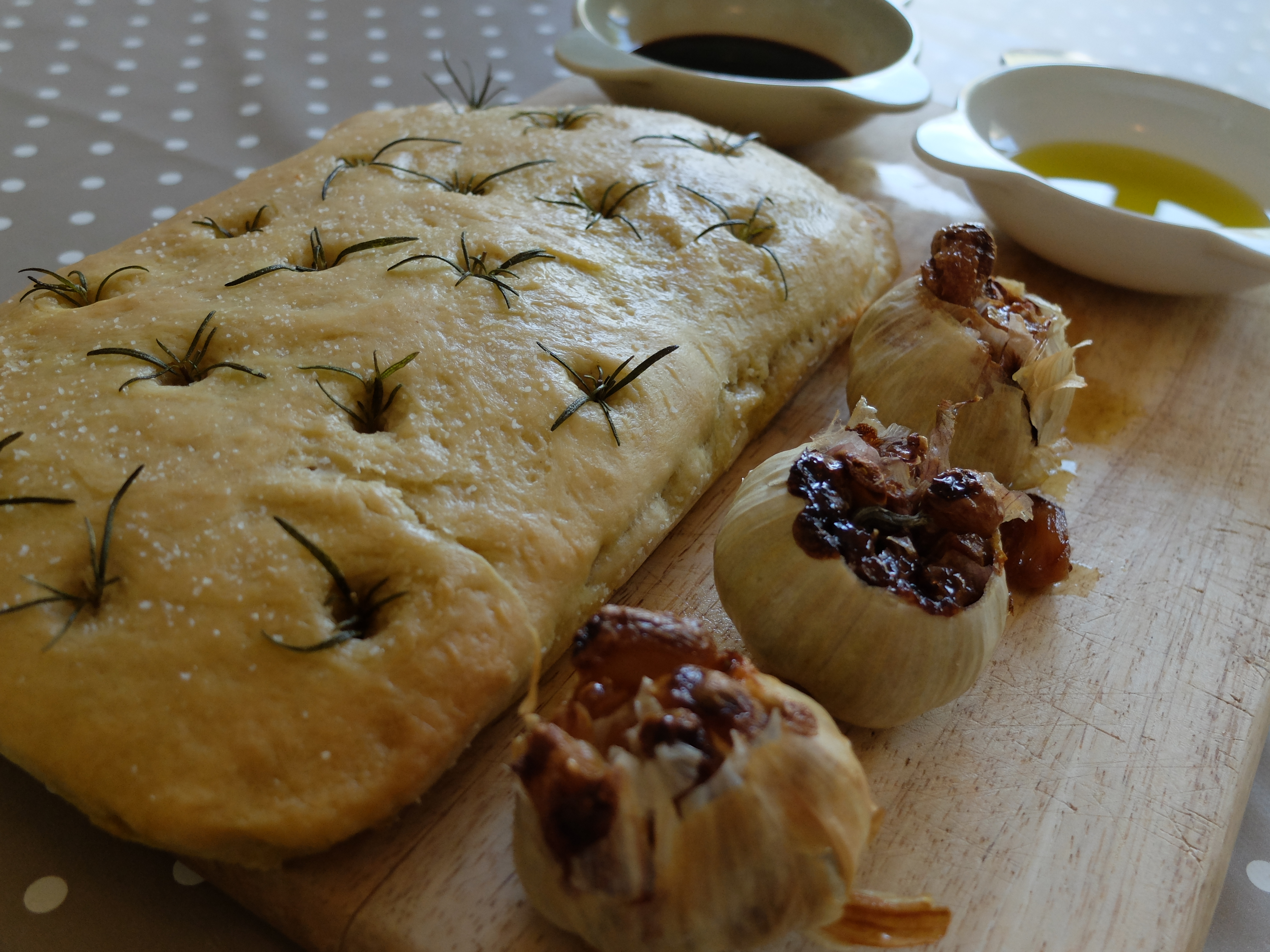 Bake for about 20-25 minutes until firm and golden. Cool before slicing into squares. Slosh some more olive oil over the top; I served mine with roasted garlic, balsamic vinegar and (yet more) olive oil: