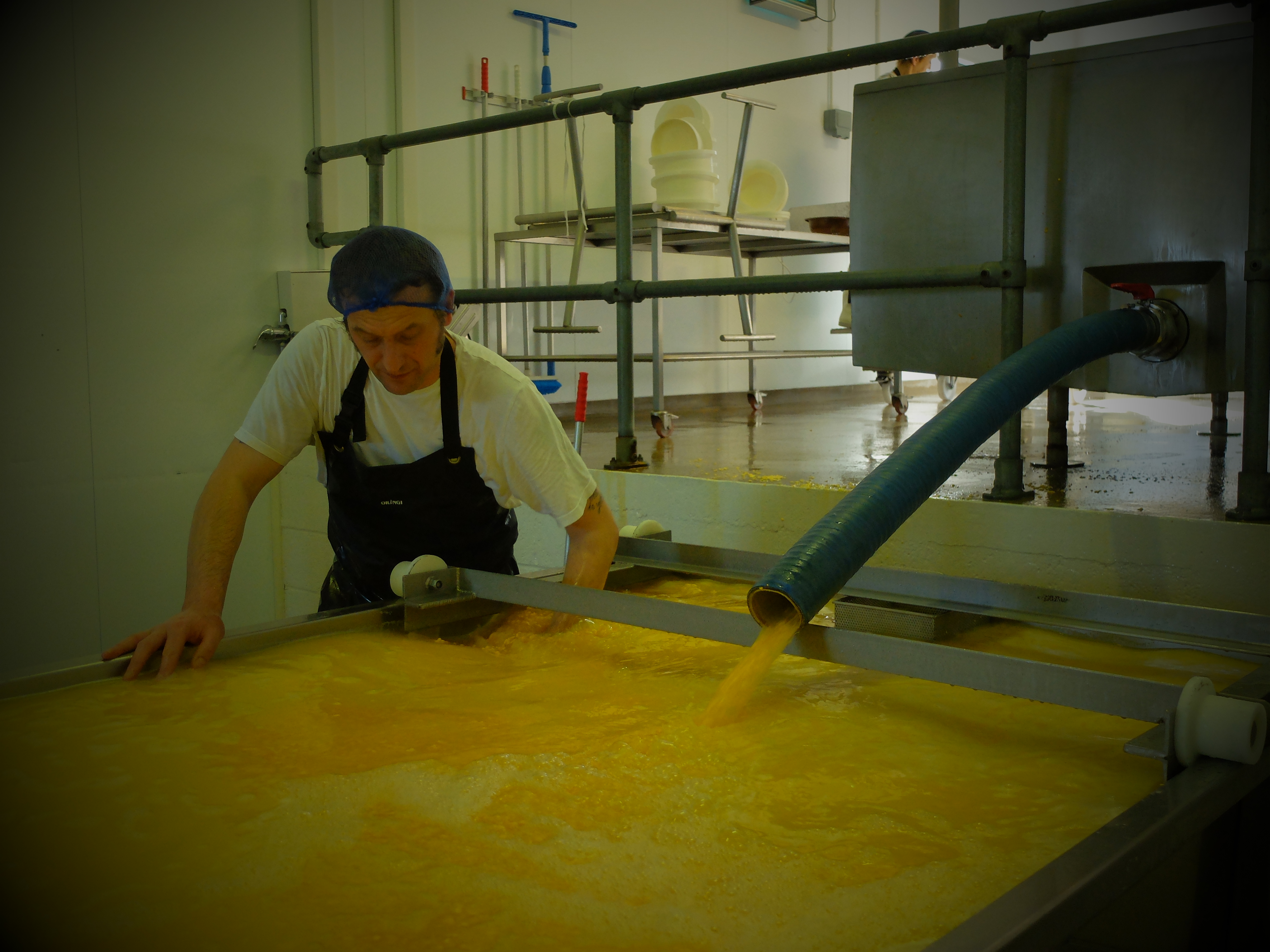 Having watched the milk change from liquid to gel to bits of solid to discernible cheese-shaped rhomboids, the next stage was almost a shock. The vat was all action, as Craig posted each slab of nearly-cheese into the chute of a metal contraption and it fell back into the vat, chopped into tiny chips. This was milling and enabled the curds to be evenly salted. David took charge of the salting with a bucket, a pair of rubber gloves and a pitchfork. Following the mill, he seized great armfuls of the curd pieces, tossing and throwing them in the vat to ensure that the salt from the bucket was evenly distributed.