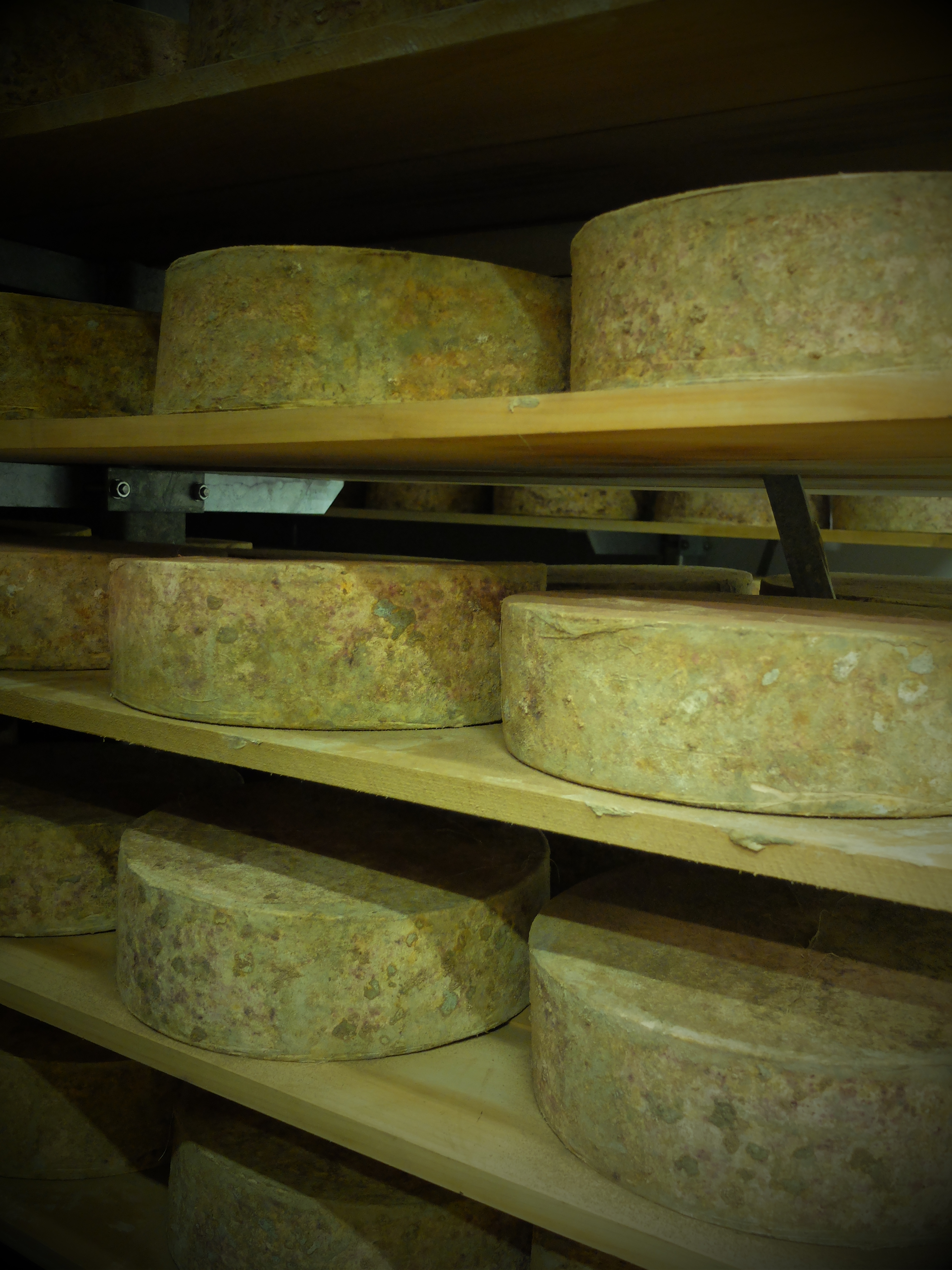 A modern room with high, barn-like ceilings and concrete floor, it was cool and quiet. Shelves of beechwood filled the room, with wheel after wheel of Sparkenhoe stacked right up to the roof. The smell was musty, slightly earthy, with a sweeter edge, like the inside of an old writing desk. Some of the cheeses were still determinedly orange, with just a salt and pepper beard of mould mottling through the lard and cloth. Others were completely mummified with a coating of what looked to be grey until I peered up close and saw lichen-like patches of green and flashes of red. The cheeses stay in the store for a minimum of four and a half months but as long as nine and must be regularly cosseted: for their first week, they’re turned every day, then every week for a month and then once a month thereafter.