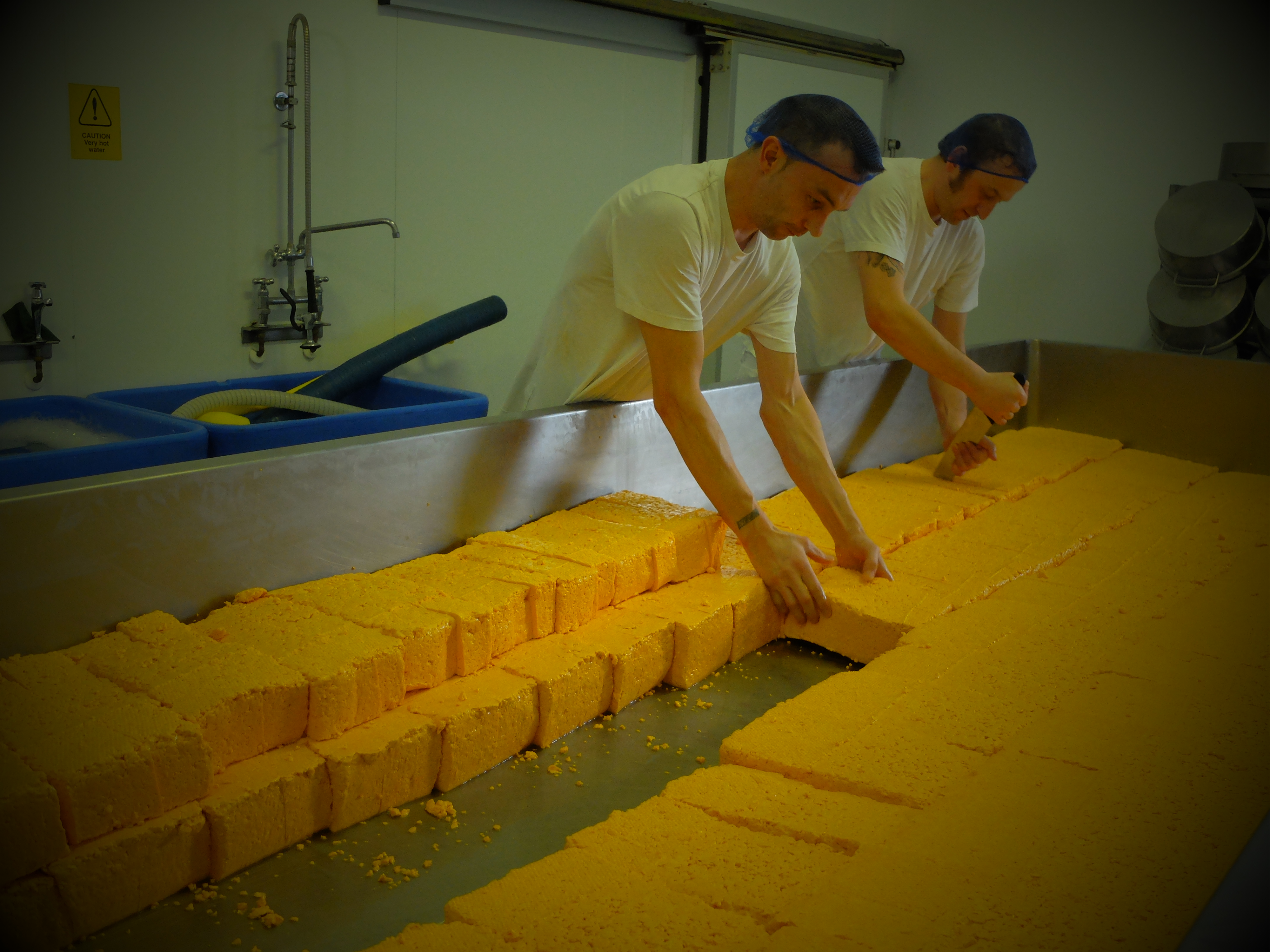 Most people know ‘Cheddar’ as one of two nouns: a hard yellowish cheese or a village in Somerset famous for its rocks and caves but it’s also a verb, the name of a process used in the production of Cheddar cheese, as well as other hard cheeses such as Red Leicester and Derby. When the curds had matted together, they were cut into cheese breeze blocks and stacked one on top of another. Every fifteen minutes they were flipped again so that each block took its turn on the top and bottom of the stack. This helped to expel more whey from the curds and also allowed the acidity to rise – making for a firmer cheese with a distinctive tang. The texture changed from popcorn-coated floppy bricks into longer, smoother forms that resembled the fibres of cooked chicken breast when you tore them apart.