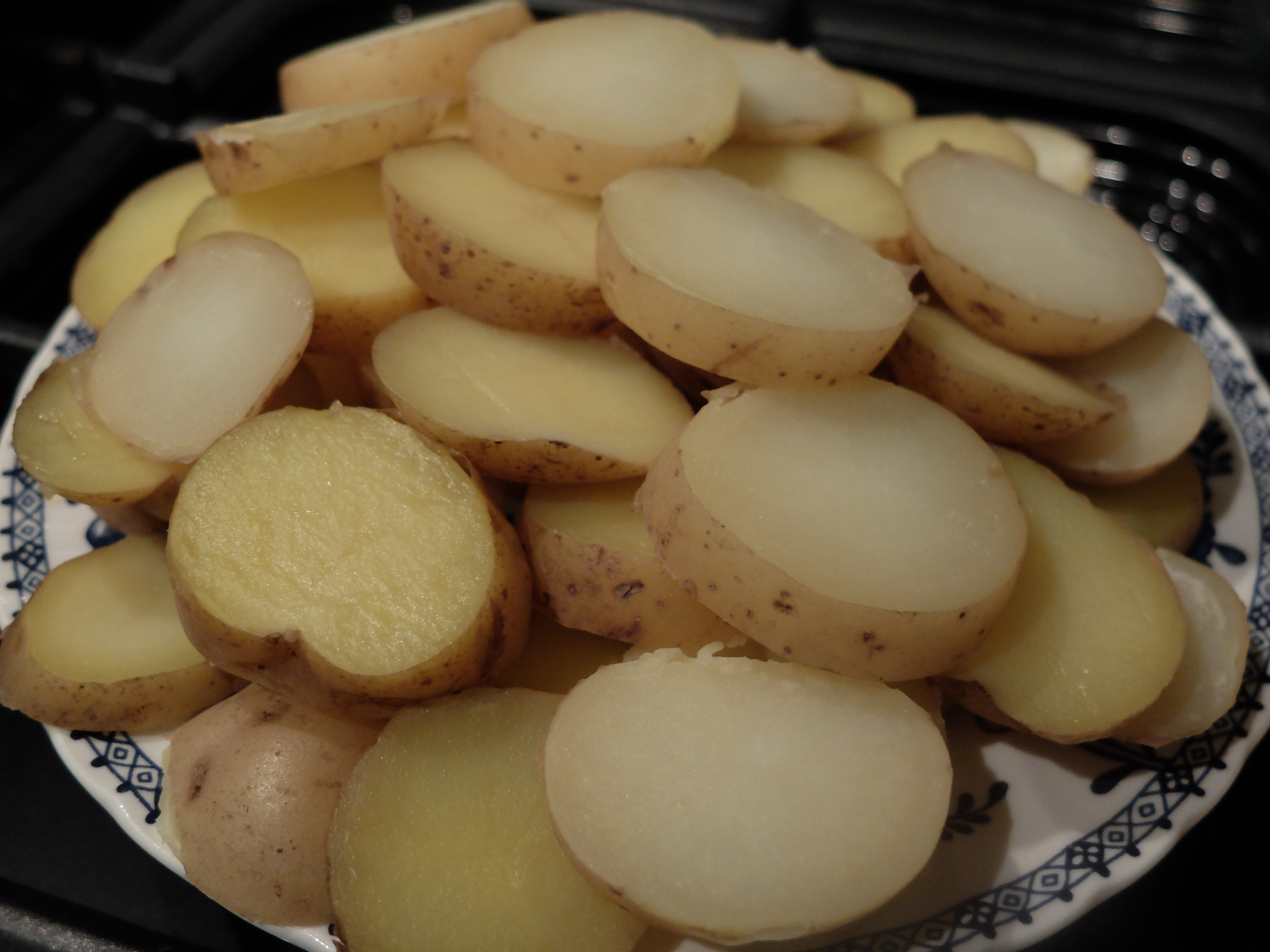 Preheat the oven to 200˚c / 180˚C fan assisted / Gas Mark 6. Parboil the potatoes until they are soft enough to slice easily but not liable to crumble (about 5-10 minutes, depending on the type and size of potato). Slice them into 2cm slices and put aside.