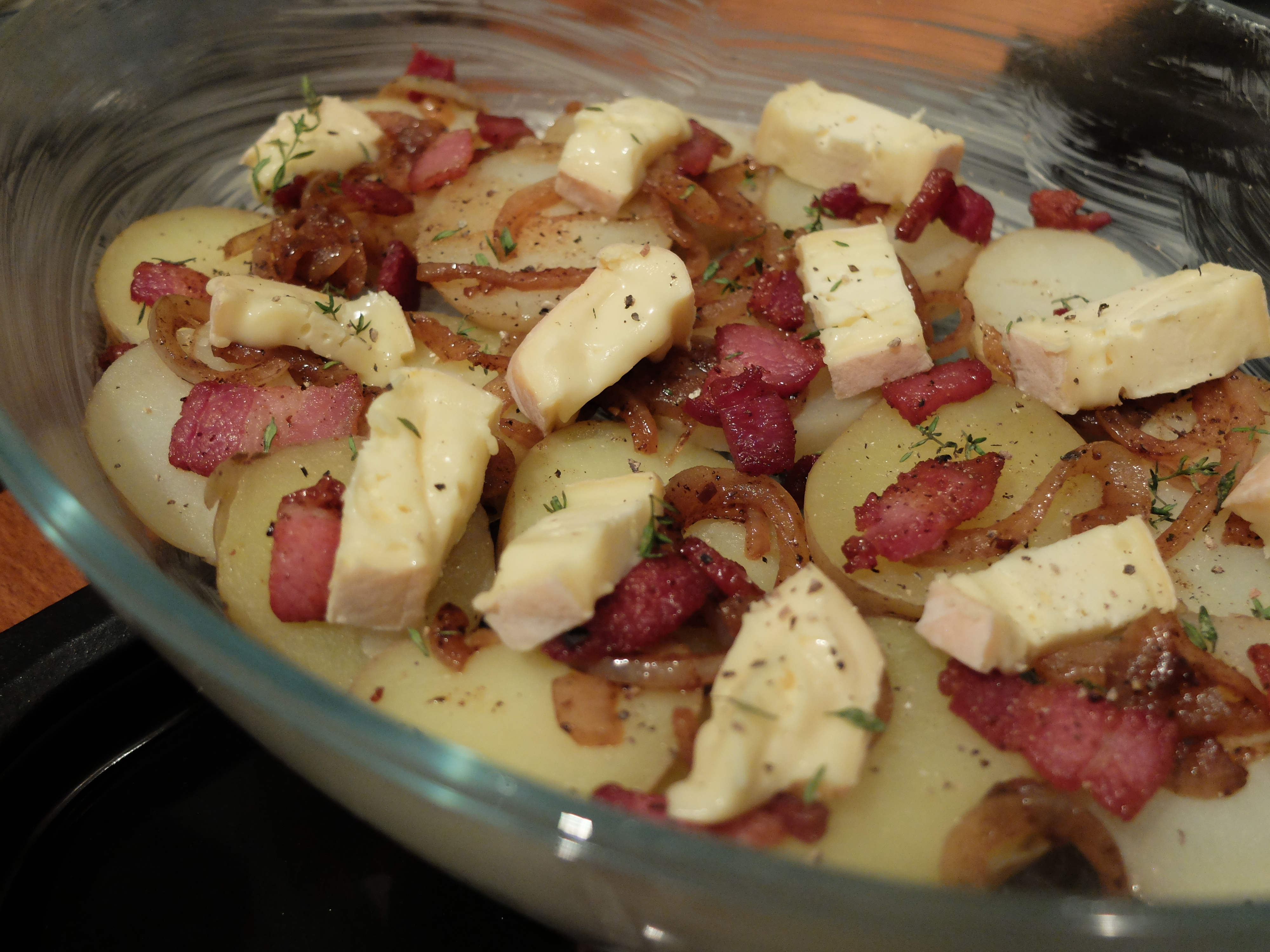 Cut the garlic clove in half and rub all over the inside of a baking dish, then lightly grease the inside of the dish. Put a layer of potato slices on the bottom of the dish and cover with a layer of the onion mixture, some lardons, thyme and cheese pieces.