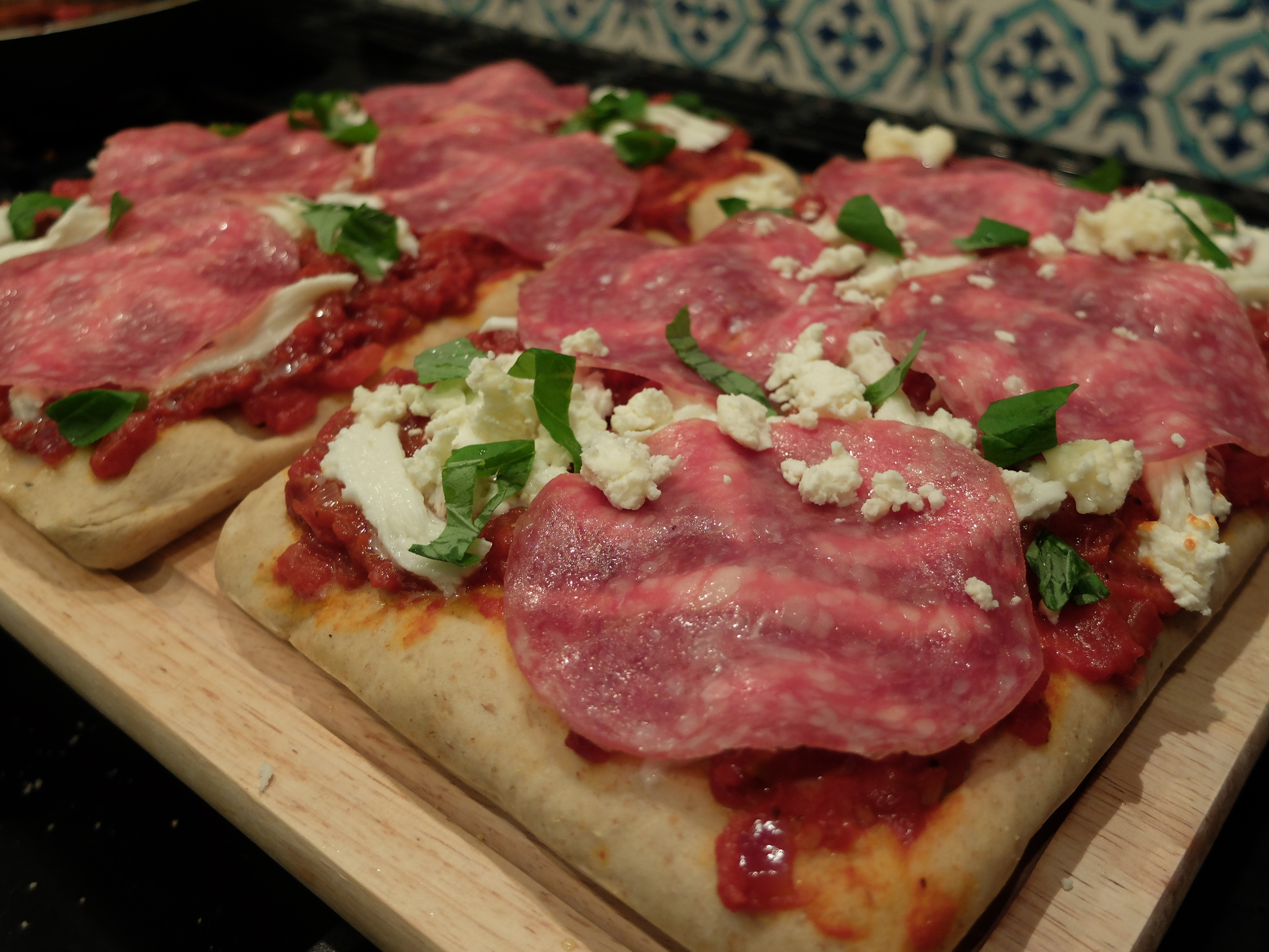 Sprinkle your pizza stone or baking tray with a little polenta and then pre-bake the bases for 10 minutes. Remove from the oven, brush with a little olive oil to keep them crisp and spread with your pizza sauce, before adding all of your toppings.