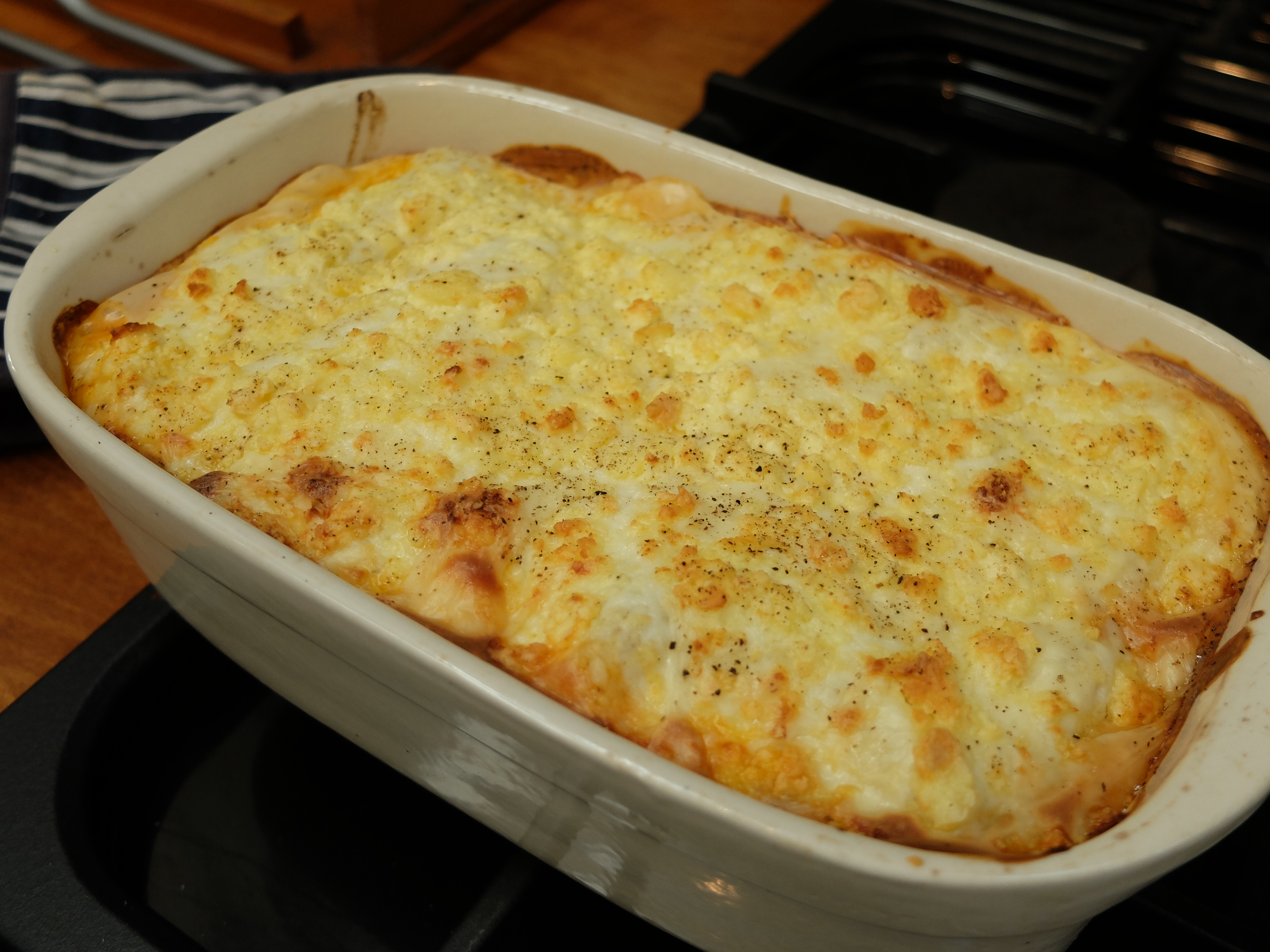 Finally finish with a layer of white creamy sauce and a sprinkle of cheese before baking it in the oven for about 35 minutes.