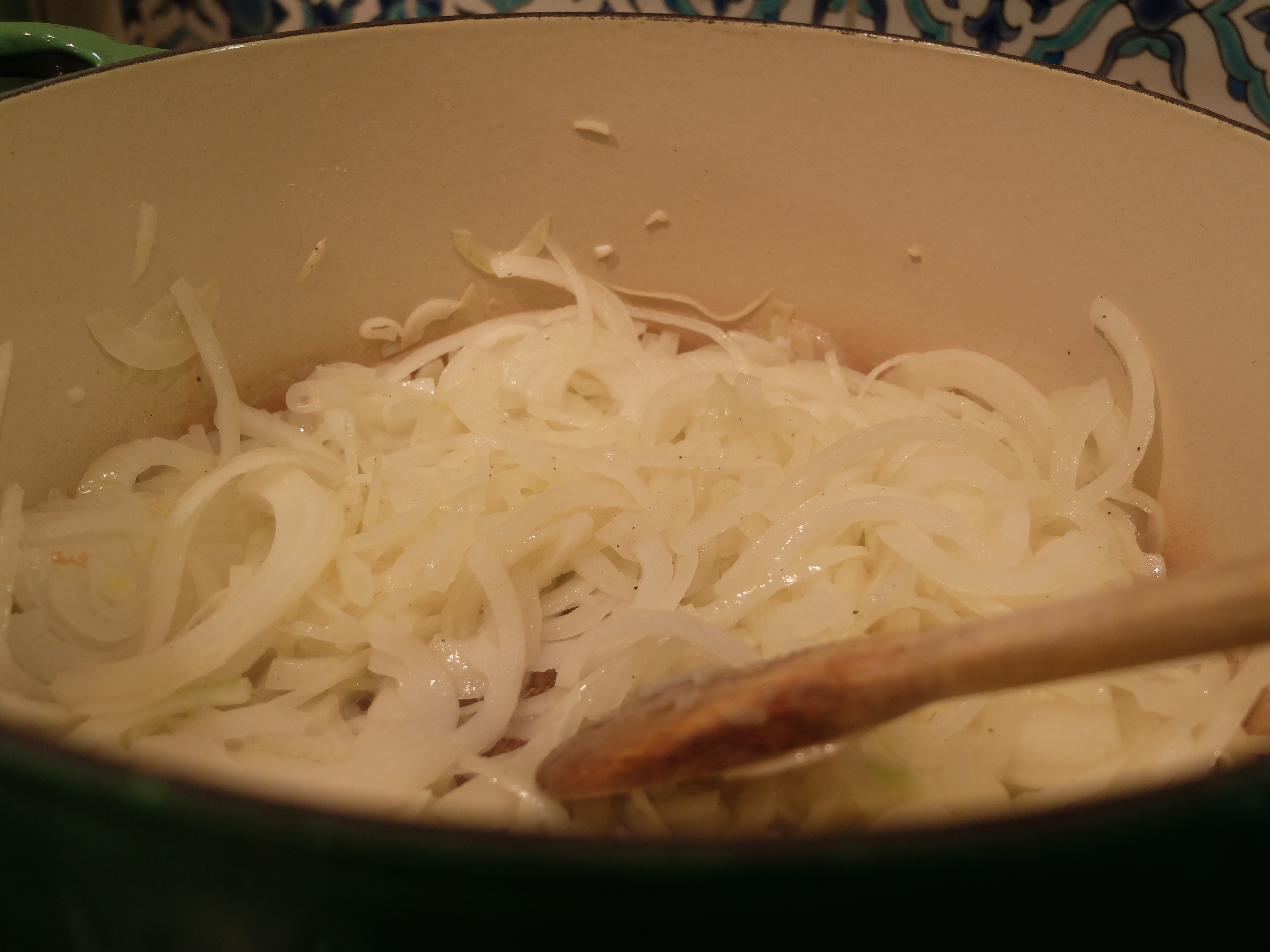 Melt the butter and oil in a large pan over a low heat. Season the onions with salt and pepper and cook them until they are soft and sweet; this can take up to an hour. Make sure they don’t catch and burn on the bottom of the pan.