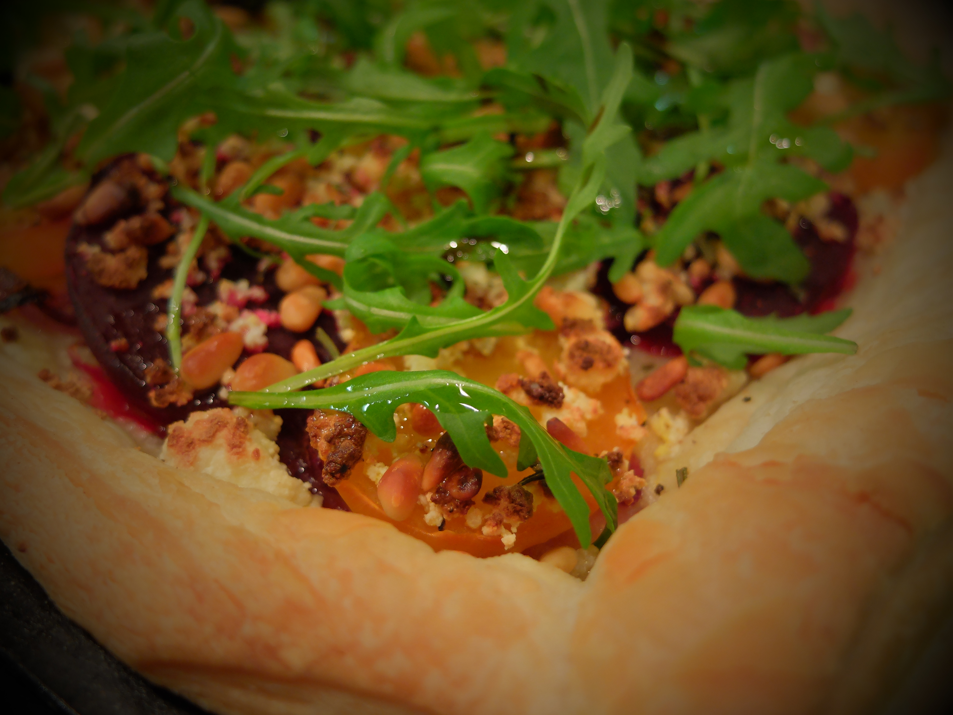 Anyone who read last Friday’s post will remember that I was in a grumpy, sorry-for-myself pizza-eating mood. It was therefore pizza that sprang to mind when I received some stunning yellow beetroot in my weekly veg box. Not only is it as pretty as sunshine it also has the advantage of not turning you into Lady Macbeth when you try and peel it or of causing alarm when you go to the toilet the next day (ah, come on, we’ve all done it). This photo doesn’t do it justice but here it is anyway with its traditional cousin.