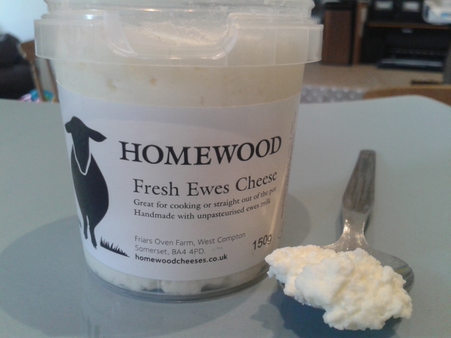 I said last week, didn’t I, that you wait for months on this blog and then three ewe’s milk cheeses come along at once? Well, here’s the third. I didn’t mean to choose another sheepy one this week but then I saw these little pots of strained curd, quite unlike any cheese I’ve tried before, so couldn’t resist buying one. Plus, it’s the season for fresh sheep’s milk cheese, given that they tend to stop producing milk in the winter months. So here is the pot of ovine temptation that lured me in: