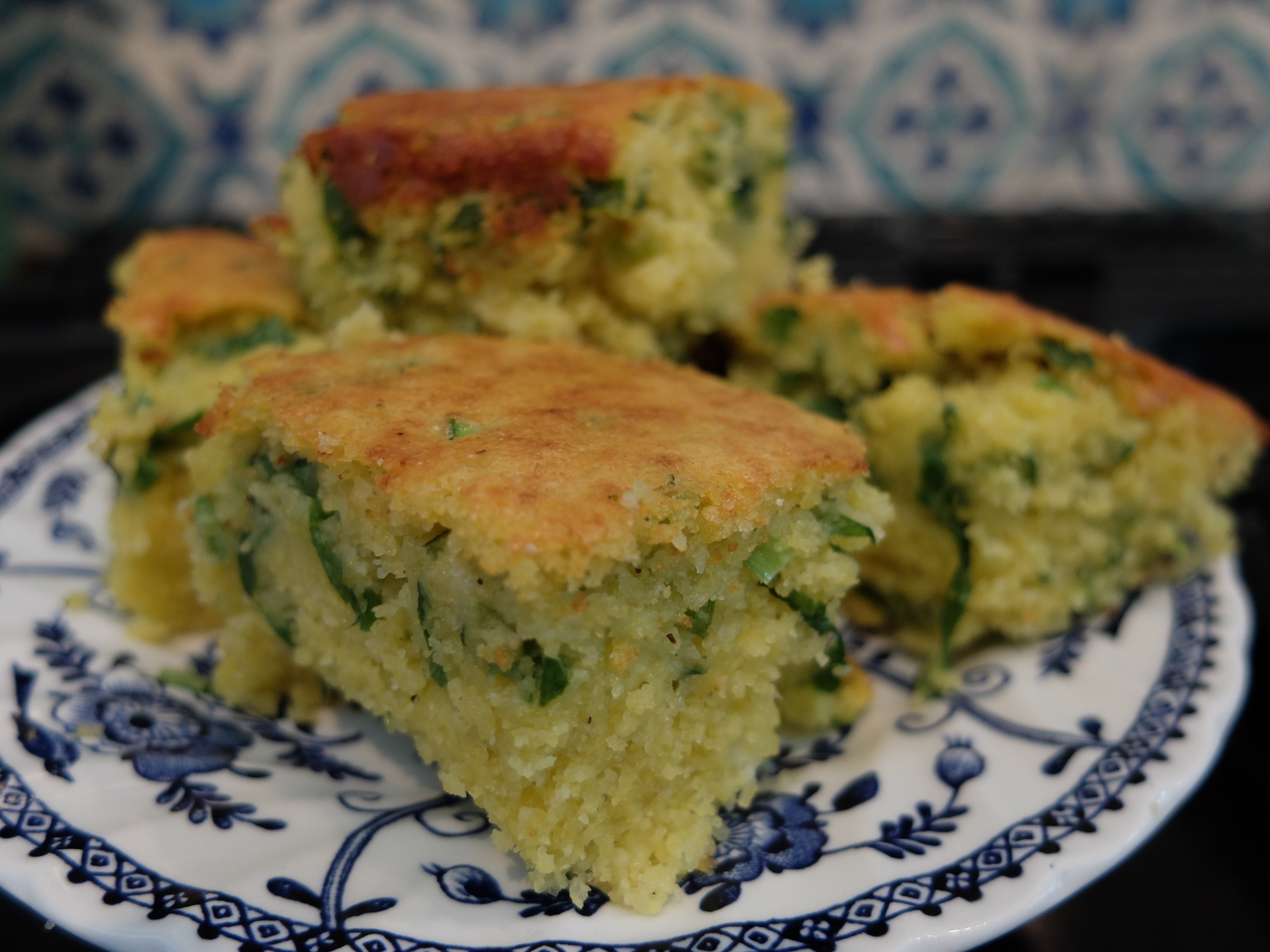 It’s been a while since I posted a cheesy recipe on here but the lovely chaps at Wilde’s Cheese sent me away with such a mammoth cheese doggy-bag that I had two choices: use all the pieces to build a cheese igloo, or get my cooking cap on. As well as cheese, they also gave me a gorgeous bunch of wild garlic, the last of the season. I can only find wild leeks round here so this was a real treat. Searching for inspiration, I came across and slightly adapted this recipe, which seemed the perfect way to wed up some of my ingredients. The result was lovely, gritty cornbread, studded with melty bits of curd cheese. I halved the quantity of wild garlic in the recipe but even so it packs a punch, so probably not a great first date food. Fortunately, I am old and well past all that malarkey.